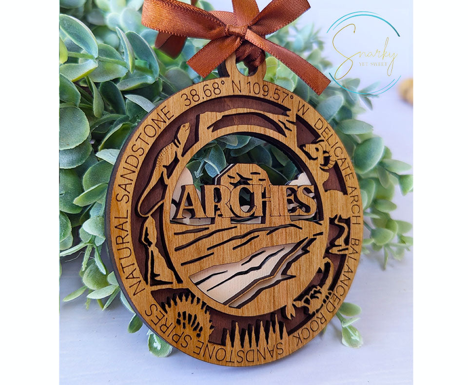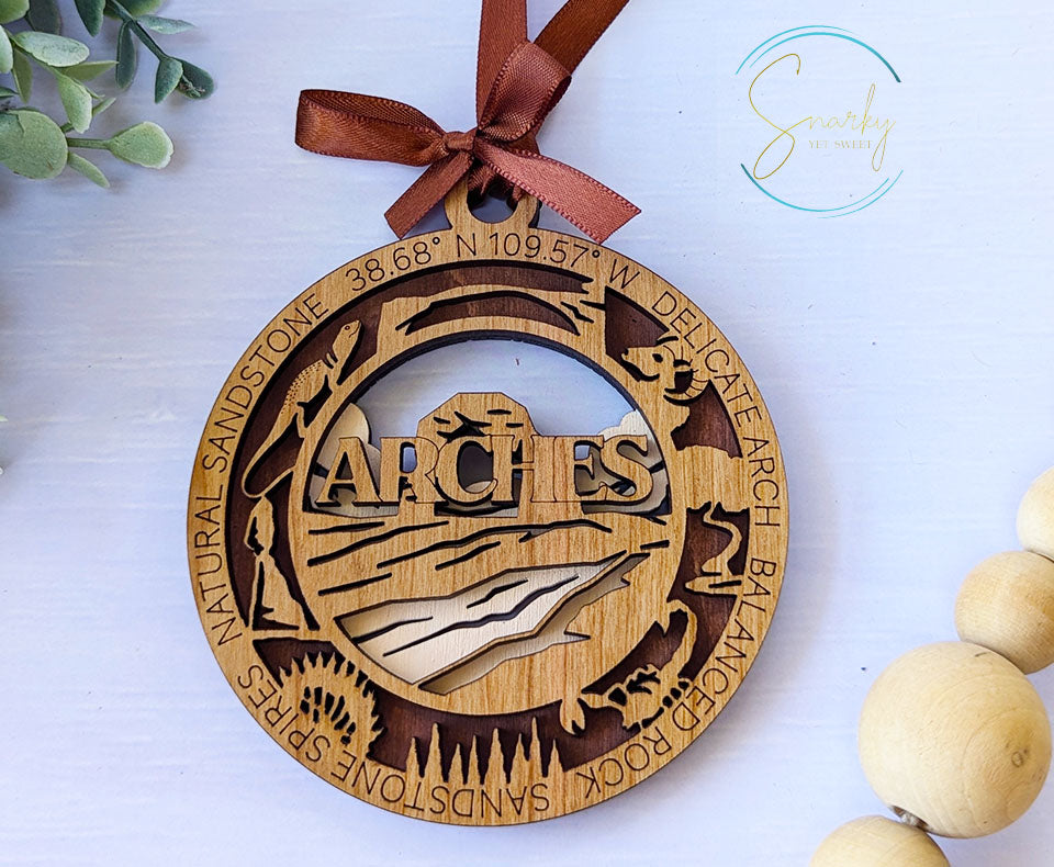 Relive your favorite trip to Arches National Park with this beautiful handmade wood ornament. Ornaments are hand painted with details from the park and a gorgeous laser cut and engraved cherry wood that features many icons specific to Arches and words and phrases for that park. These ornaments are great reminders of your favorite family vacation or hiking adventure and make great gifts for the avid hiker or adventurer in your life.