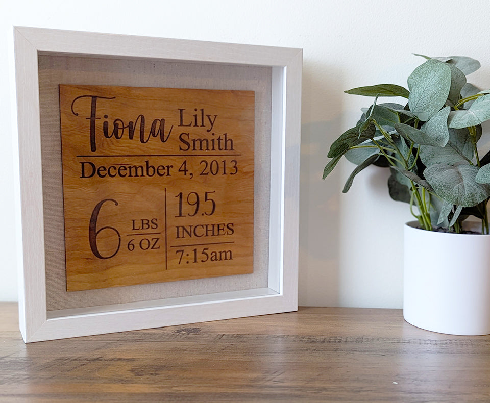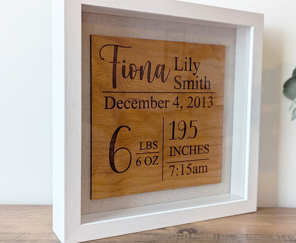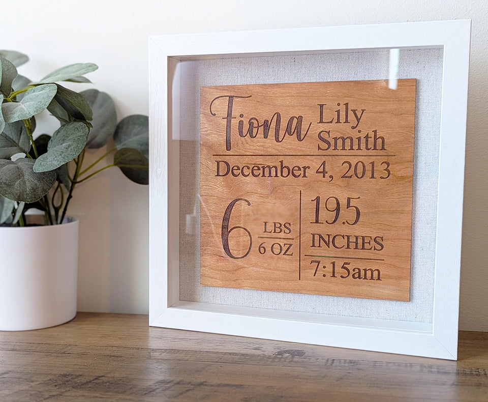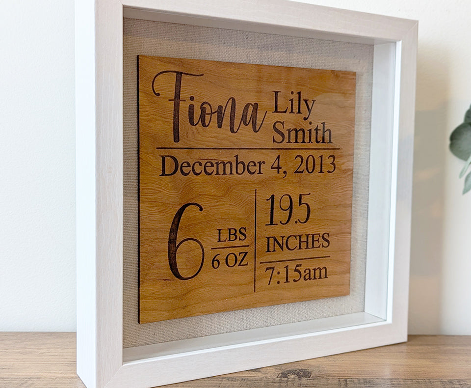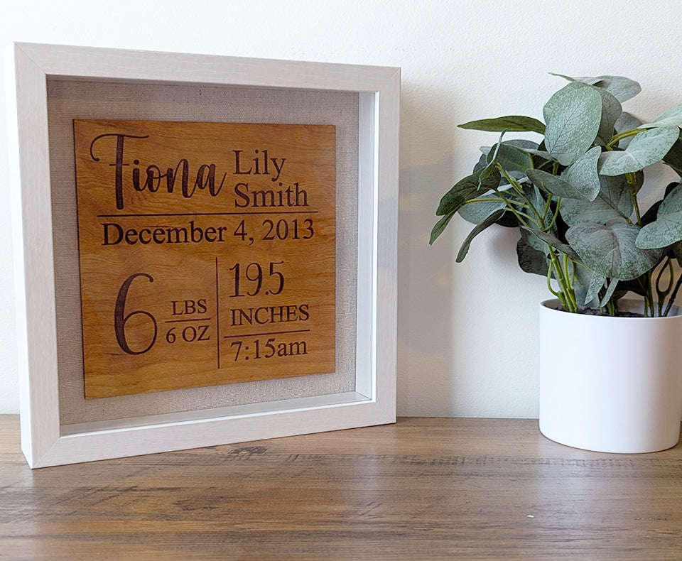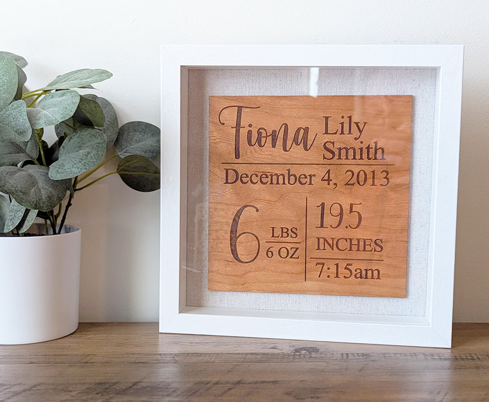 Gorgeous engraved cherry wood make this shadow box wall decor the perfect item for your home or as a gift! This item starts with a 9" square white wood shadow box and a laser engraved piece of cherry wood with all the baby birth stats details.
