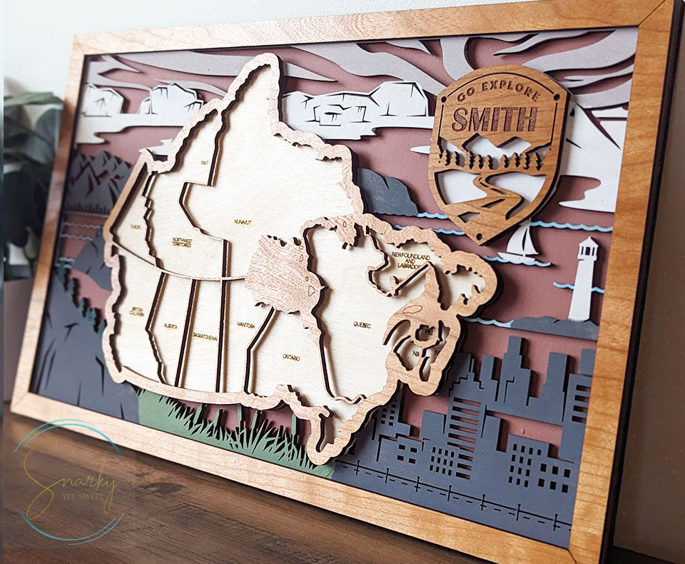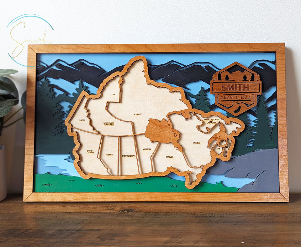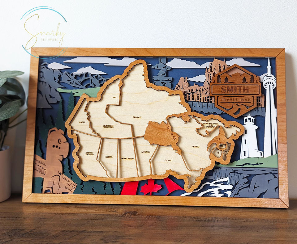 The Canada Travel Map can be used to record the provinces and territories that you have visited while travelling across Canada. This map is fully customizable with 3 different backgrounds available and 11 customizable name plates to make a truly unique product.