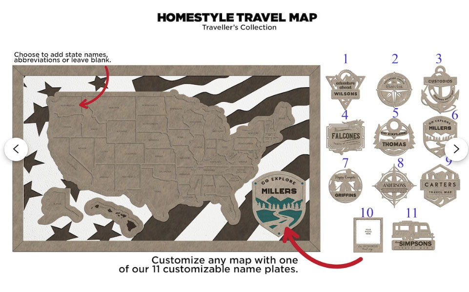 Nameplate text: Usually a last name but could also be couples' names, National Parks Map, Our adventures, etc.