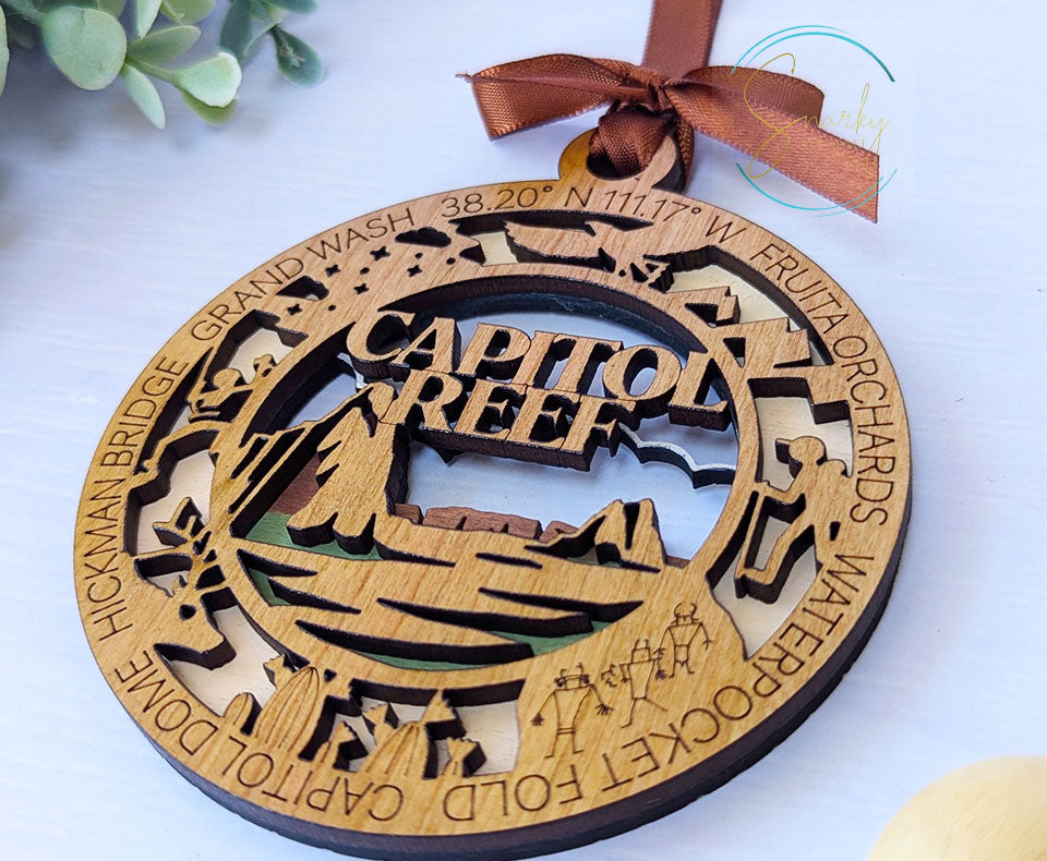 Relive your favorite trip to Capitol Reef National Park with this beautiful handmade wood ornament. Ornaments are hand painted with details from the park and a gorgeous laser cut and engraved cherry wood that features many icons specific to Capitol Reef and words and phrases for that park. These ornaments are great reminders of your favorite family vacation or hiking adventure and make great gifts for the avid hiker or adventurer in your life.