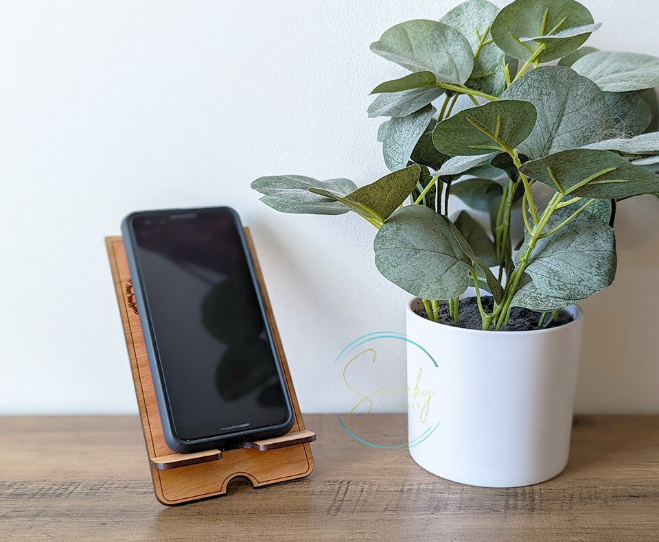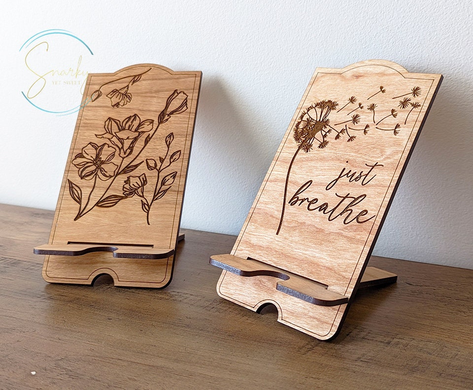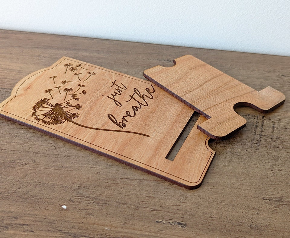 Cell phone stand, wood cell phone holder, cell phone holder for desk, just breathe dandelions, gift for her, mother's day gift