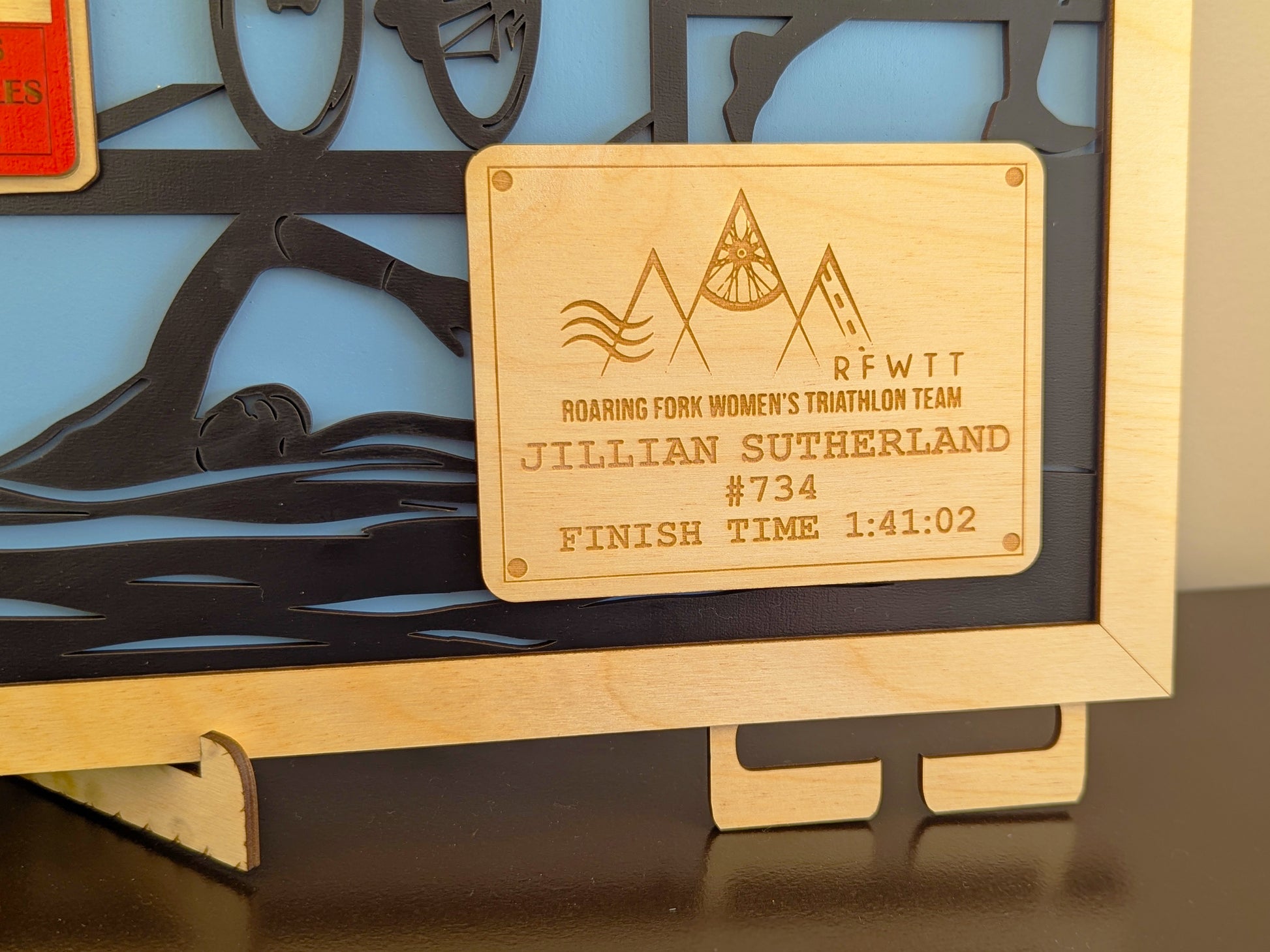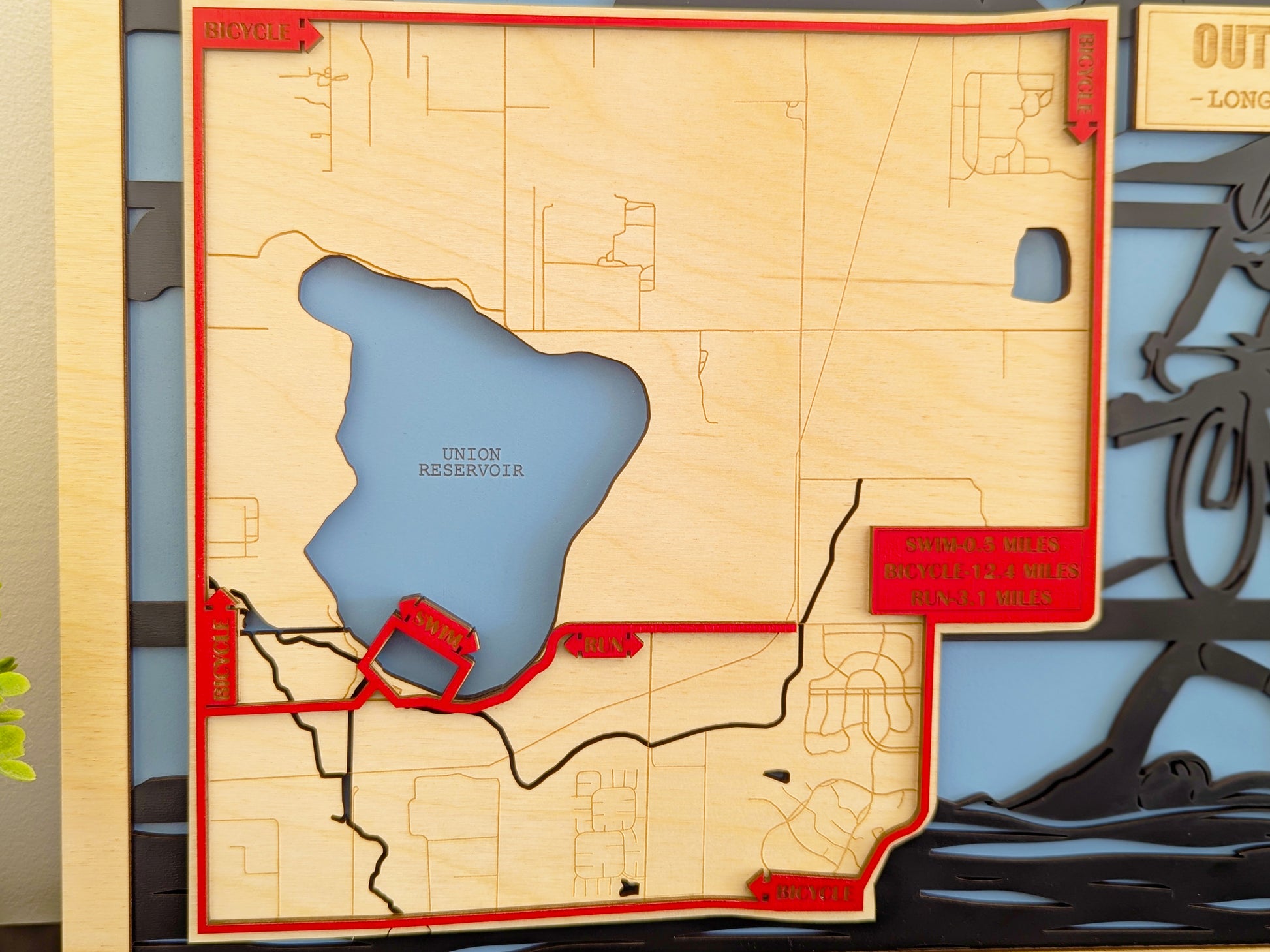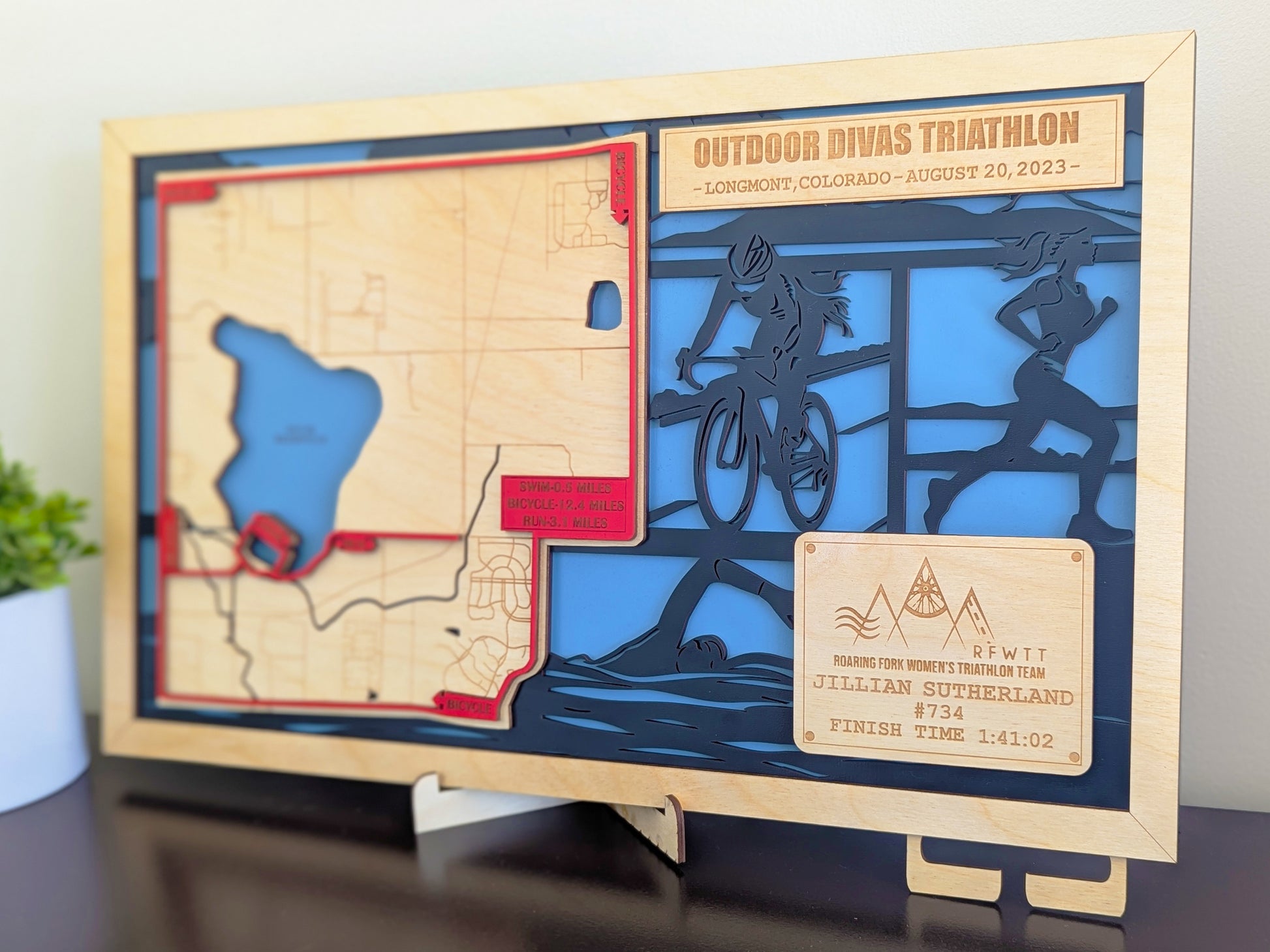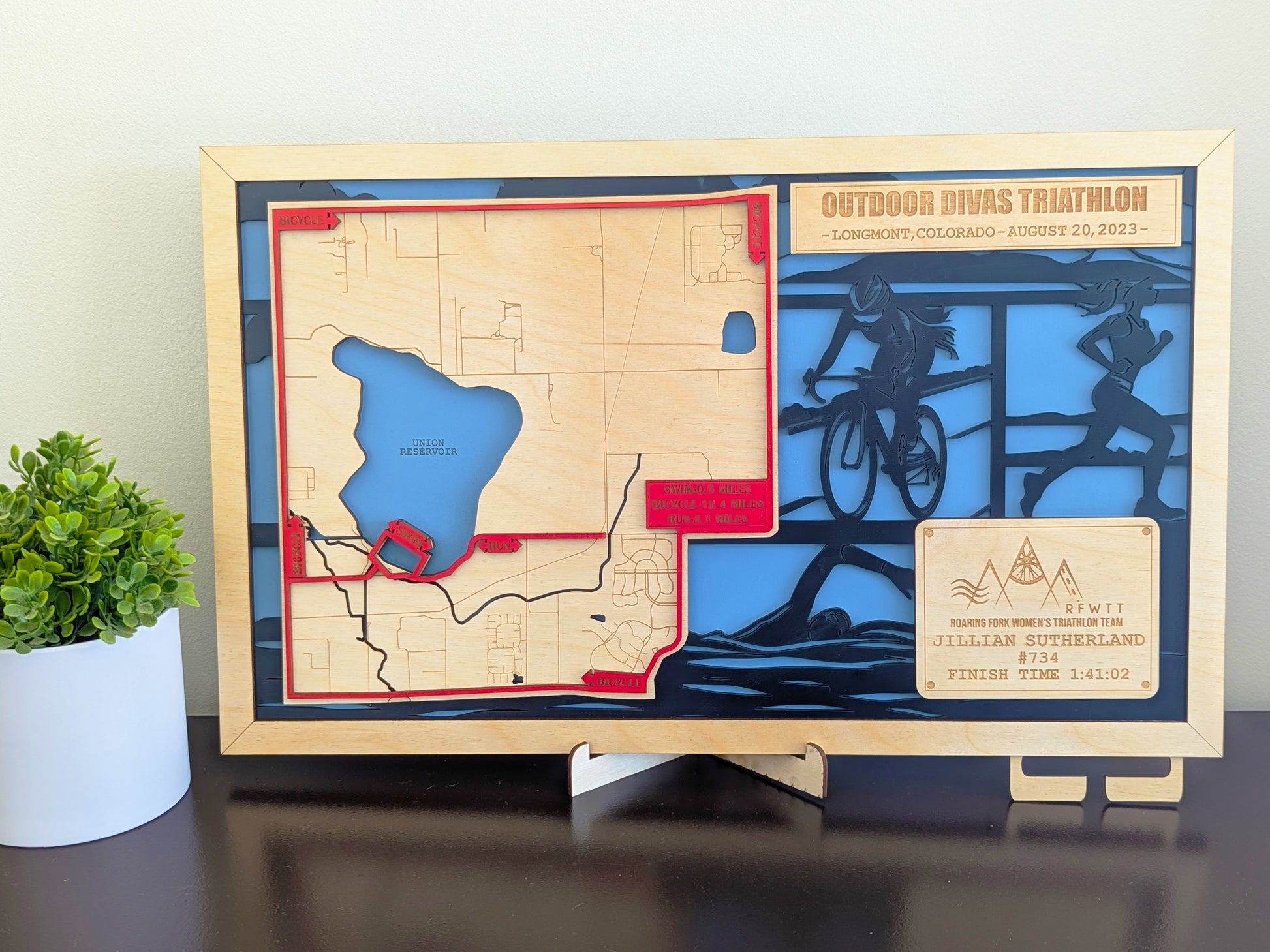 Create a truly one of a kind piece of art to remember your amazing accomplishments. This map consists of 4 layers of high quality wood; the bottom layer can be customized to the color you'd like (blue seen here), the middle layer in black showcases scenes of the area as well as silhouettes of runners (and bikers and swimmers if it's for a triathlon - male and female versions available), the top layer is natural birch wood engraved with the streets of the area along with plaques that include any information you'd like for your map such as your team name and logo, bib number, times, distance, etc. The final layer in red showcases the actual route along with distances for each leg.