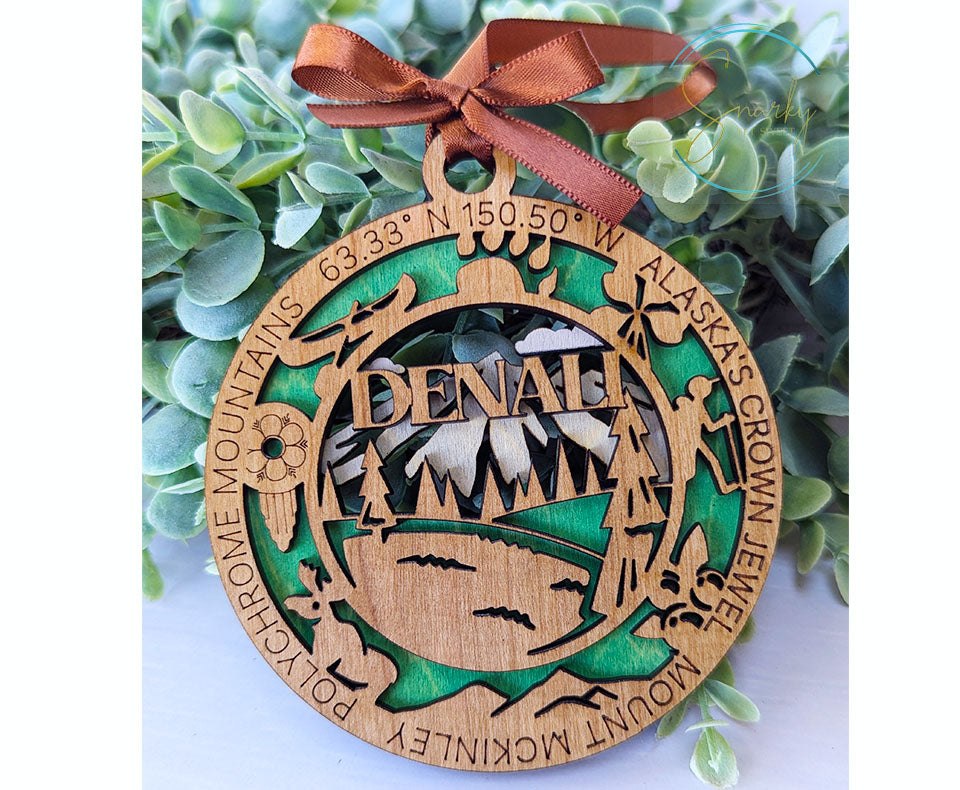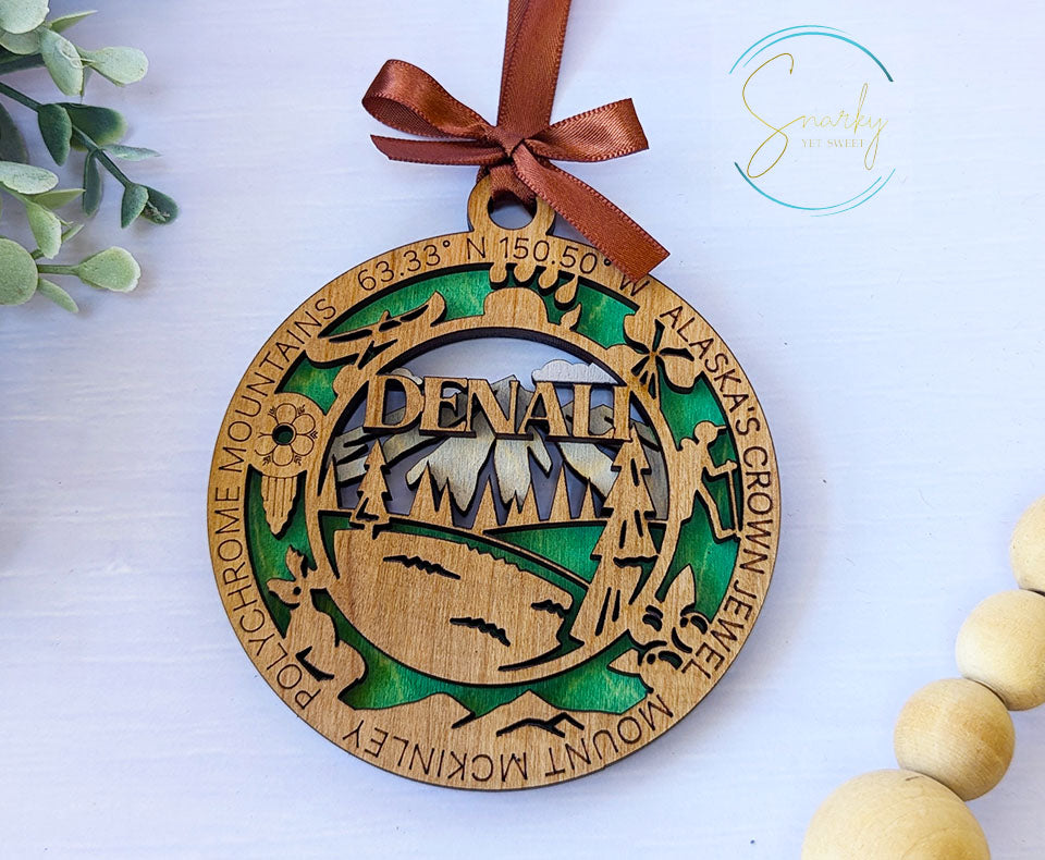Relive your favorite trip to Denali National Park with this beautiful handmade wood ornament. Ornaments are hand painted with details from the park and a gorgeous laser cut and engraved cherry wood that features many icons specific to Denali and words and phrases for that park. These ornaments are great reminders of your favorite family vacation or hiking adventure and make great gifts for the avid hiker or adventurer in your life.