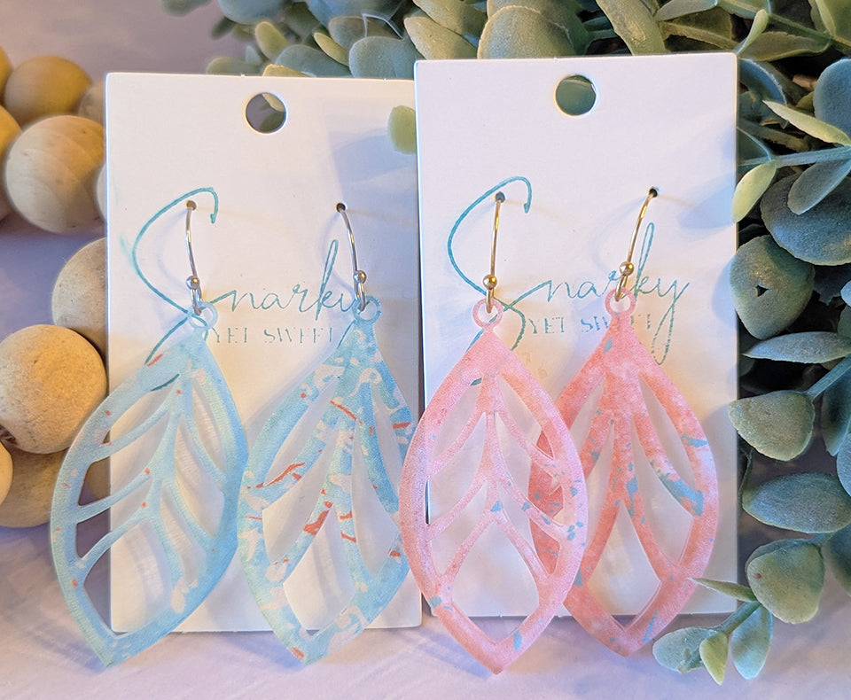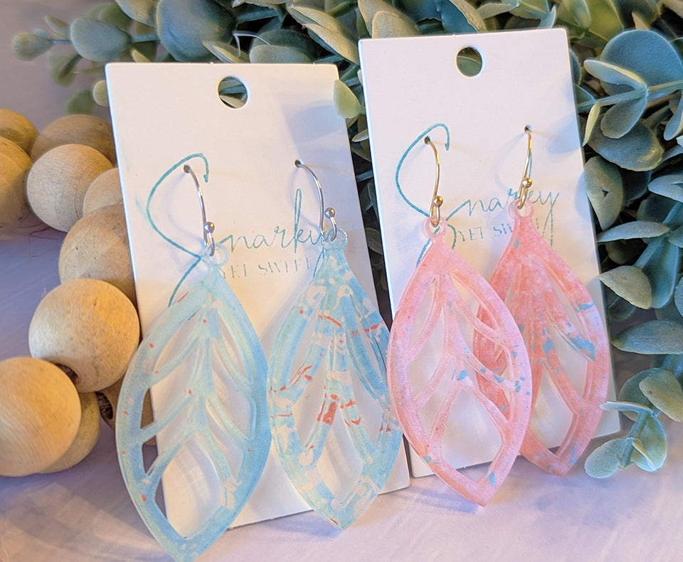 Pink and blue printed clear acrylic earrings. These beautiful lightweight earrings are perfect for Spring or everyday! UV printed paint splatter pattern in 2 different colors to choose from with stainless steel hooks, hypoallergenic earrings. These earrings are lightweight, you won't even feel them when you wear them.