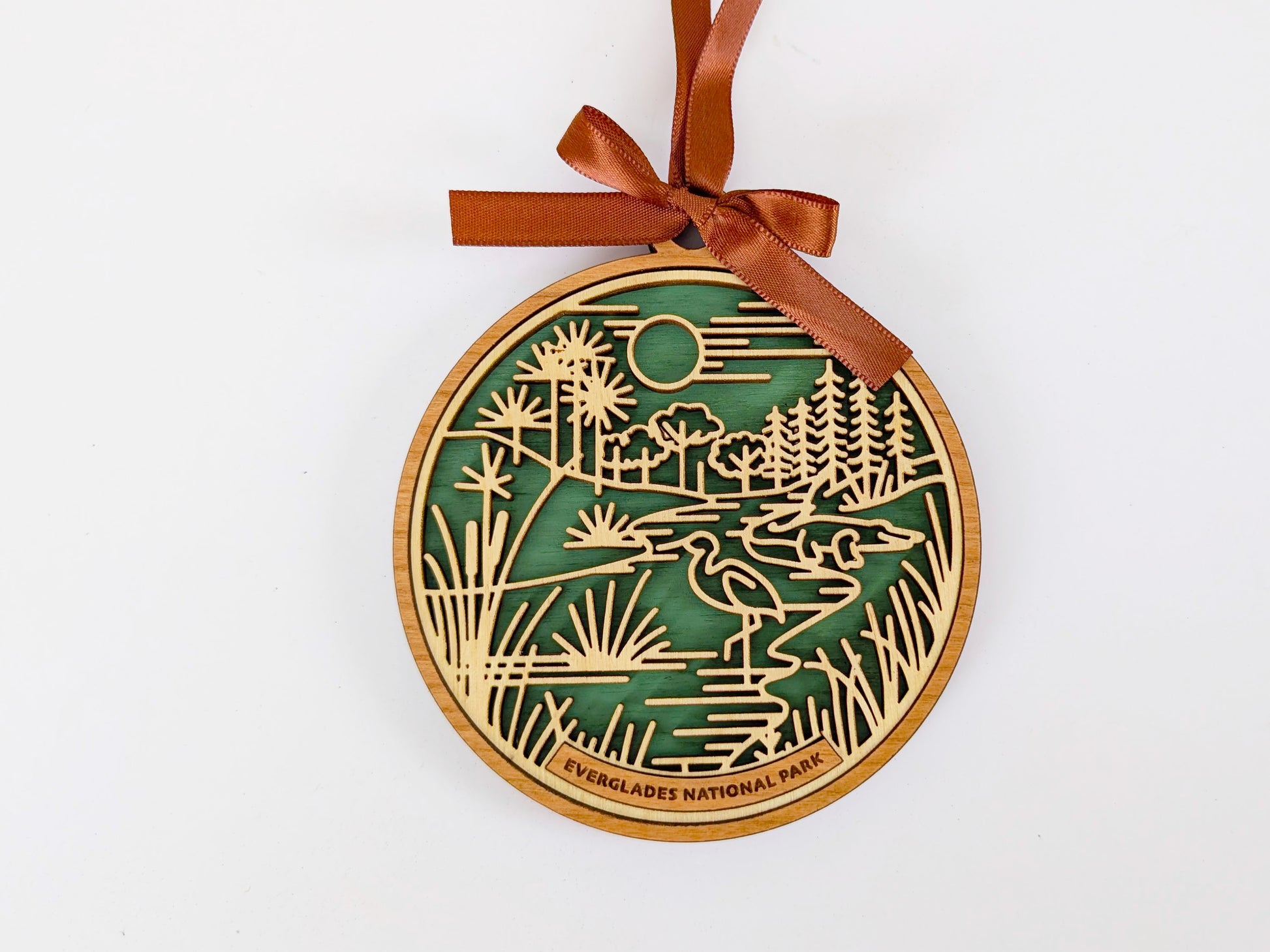 Relive your favorite trip to Everglades National Park with this beautiful handmade wood ornament. Ornaments are hand painted with details from the park and a gorgeous laser cut and engraved cherry wood that features many icons specific to Everglades. These ornaments are great reminders of your favorite family vacation or hiking adventure and make great gifts for the avid hiker or adventurer in your life.
