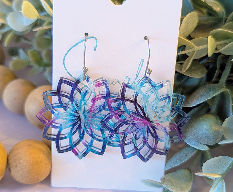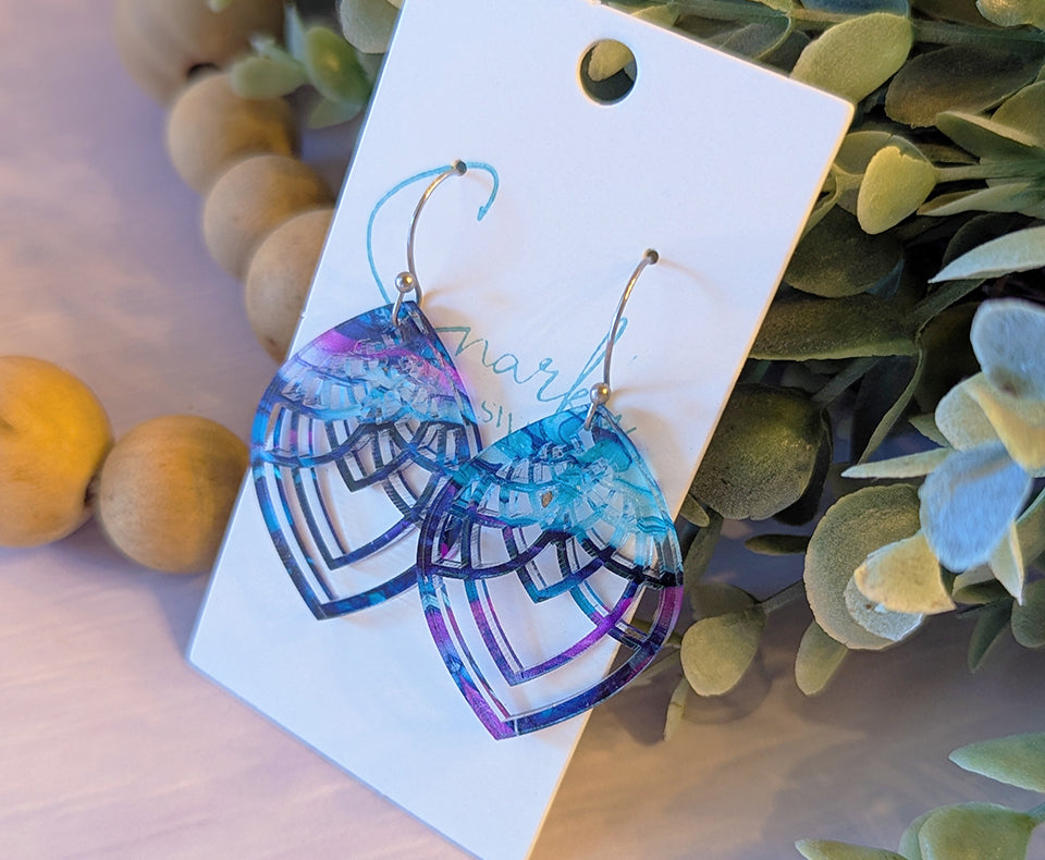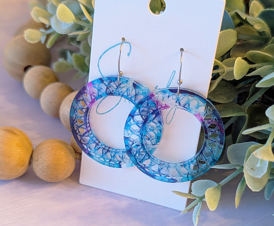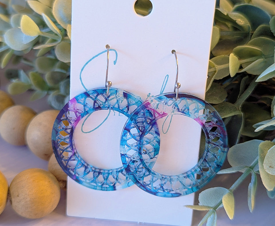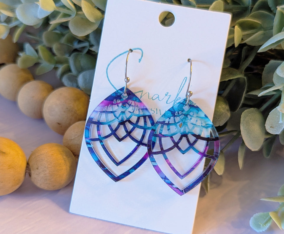 Purple and teal alcohol ink style acrylic filagree style earrings. These beautiful lightweight earrings are perfect for Valentine's Day or everyday! UV printed acrylic in 3 different styles to choose from with silver stainless steel hooks, hypoallergenic earrings. These earrings are lightweight, you won't even feel them when you wear them.