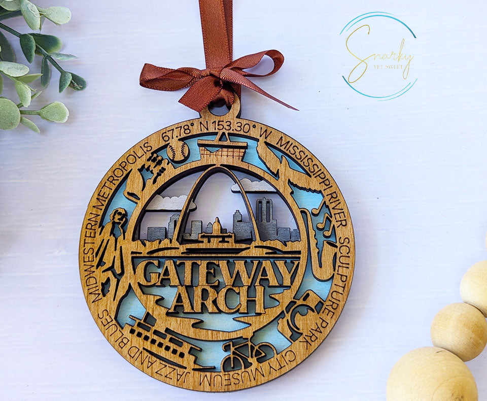 Relive your favorite trip to Gateway Arch National Park with this beautiful handmade wood ornament. Ornaments are hand painted with details from the park and a gorgeous laser cut and engraved cherry wood that features many icons specific to Gateway Arch and words and phrases for that park. These ornaments are great reminders of your favorite family vacation or hiking adventure and make great gifts for the avid hiker or adventurer in your life.