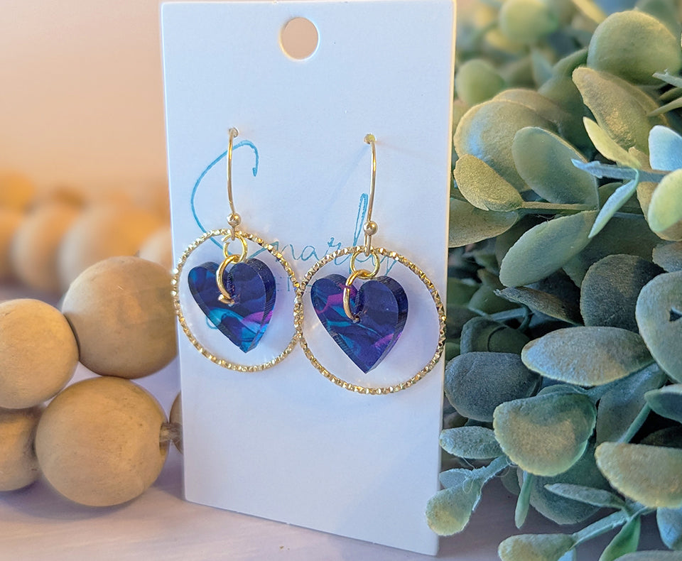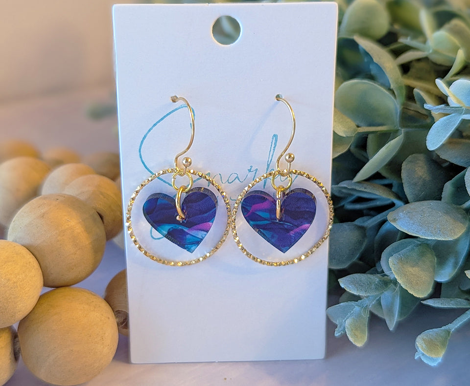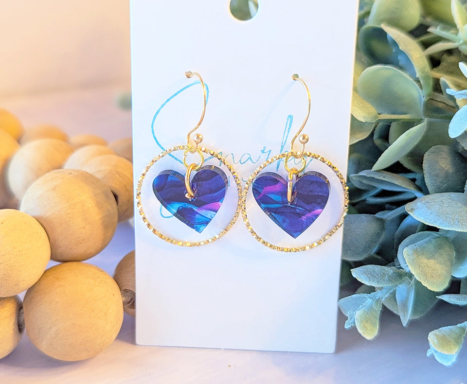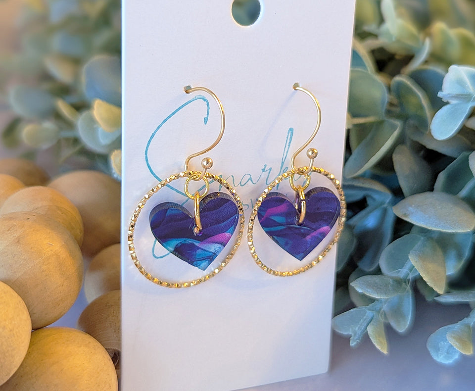 Purple and teal alcohol ink style acrylic heart earrings. These beautiful lightweight earrings are perfect for Valentine's Day or everyday! Small UV printed acrylic hearts are surrounded by 25mm gold hammered stainless steel circles with gold stainless steel hooks, hypoallergenic earrings. These earrings are lightweight, you won't even feel them when you wear them.