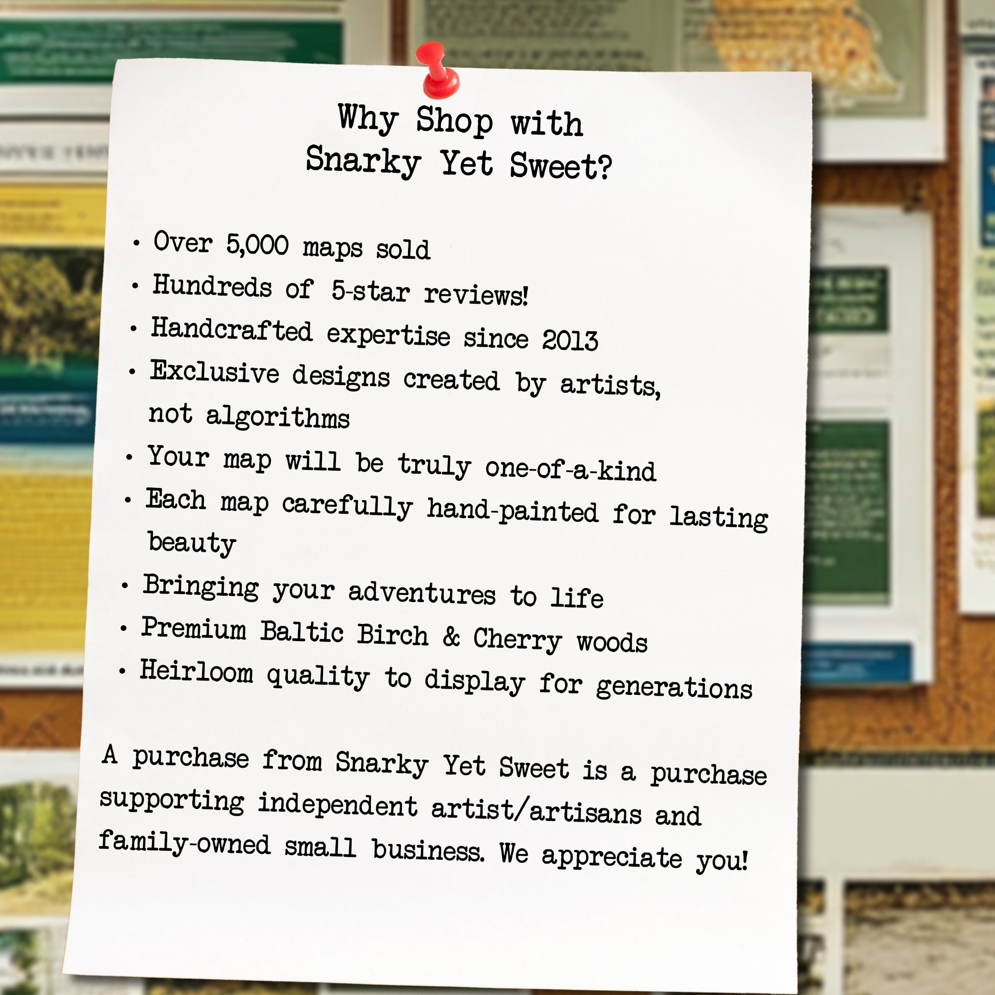Each Illinois Parks Travel Display is handcrafted by our family-owned business in Woodstock, Illinois. When you purchase from Snarky Yet Sweet, you're supporting a small business dedicated to quality craftsmanship and personal service.