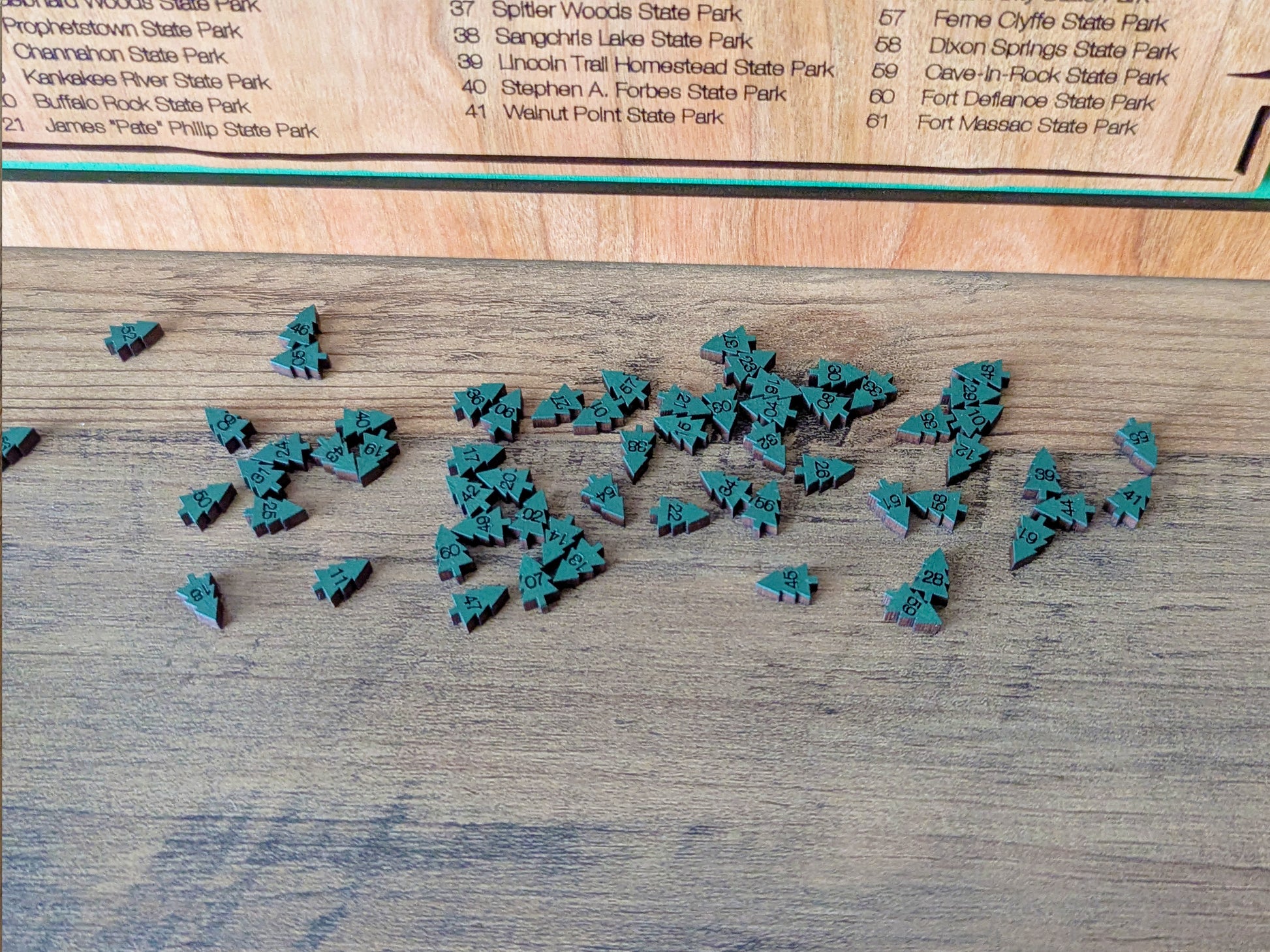 Includes matching numbered green wooden trees, one for each park, to track your visits. Full sets of replacement pieces available to purchase.