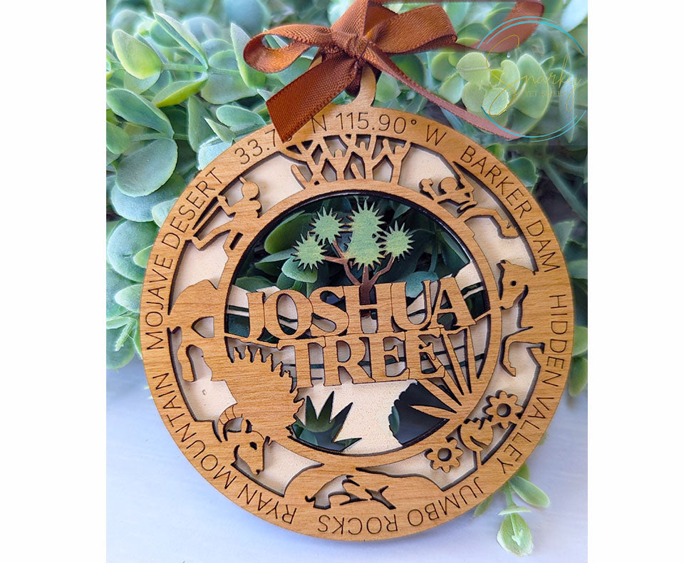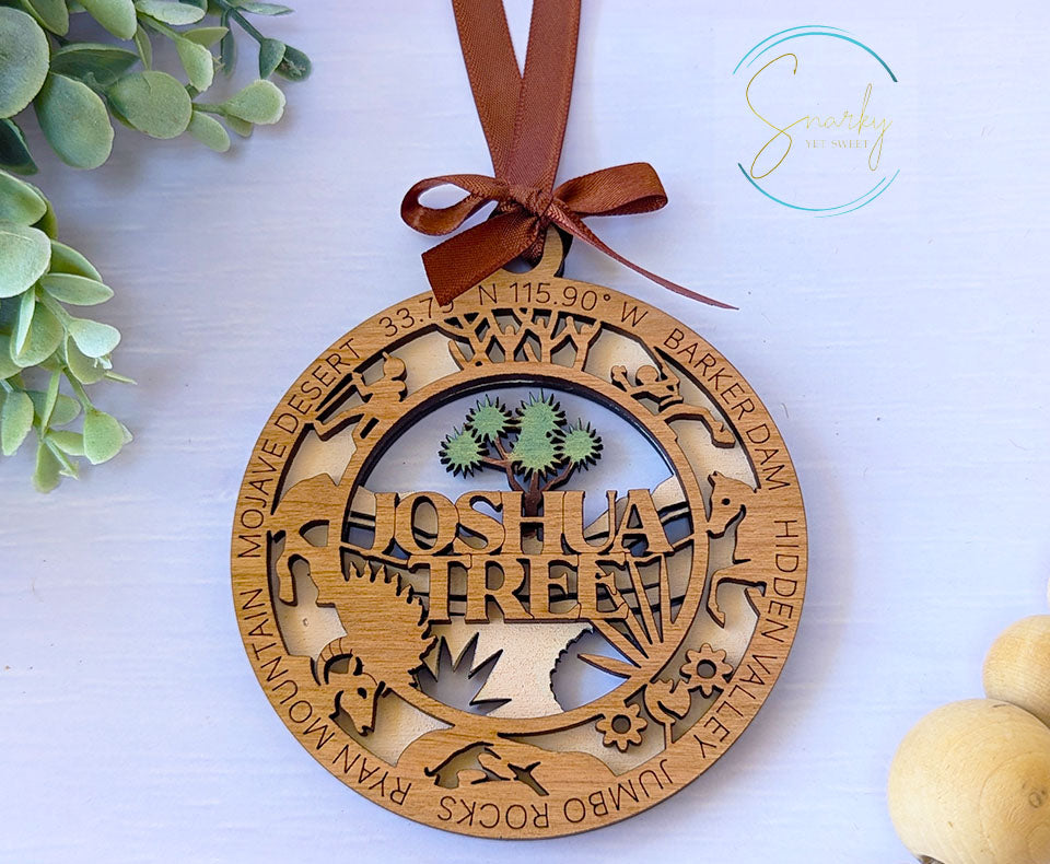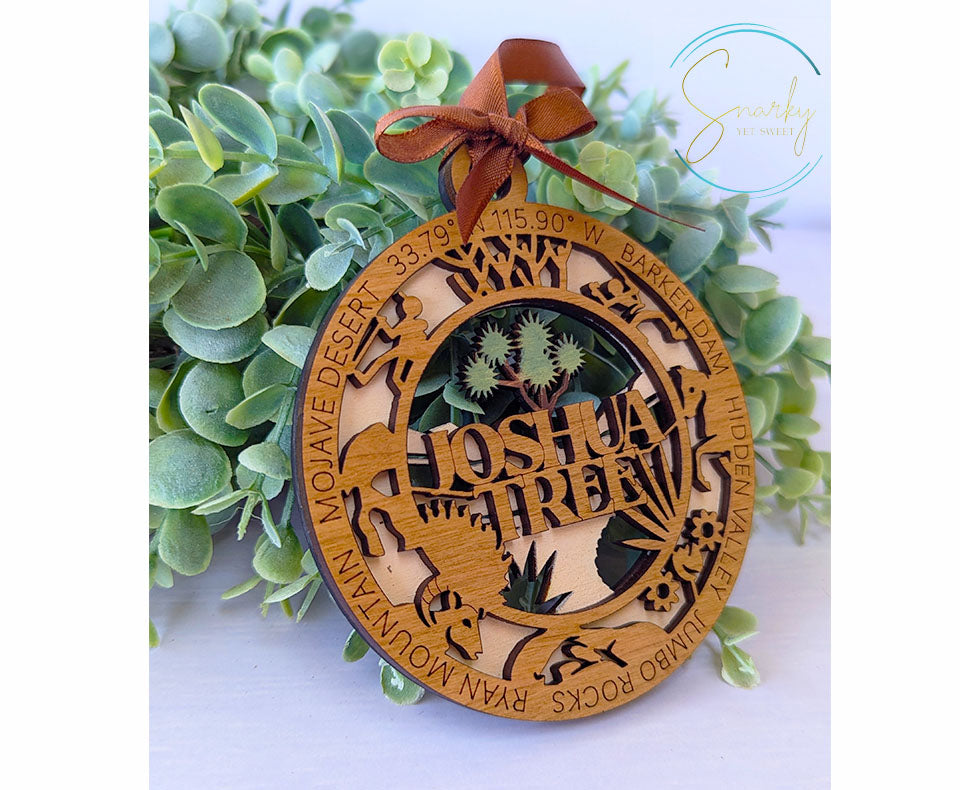 Relive your favorite trip to Joshua Tree National Park with this beautiful handmade wood ornament. Ornaments are hand painted with details from the park and a gorgeous laser cut and engraved cherry wood that features many icons specific to Joshua Tree and words and phrases for that park. These ornaments are great reminders of your favorite family vacation or hiking adventure and make great gifts for the avid hiker or adventurer in your life.
