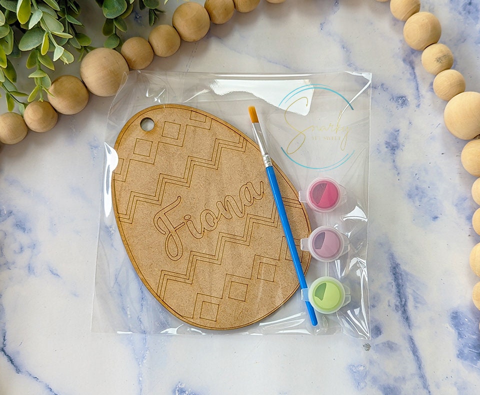 These paint your own kits are perfect for kids. Kit includes 1 egg, approximately 4.5x6" and 1/8" thick. Egg will include your child's name to make it even more fun and personal! Each kit comes with 3 paint pots of acrylic paint colors of your choice (I have too many to list so let me know what you'd like and I'll match as close as I can) along with a paint brush. Egg has a hole in the top and comes with twine so that you can hang it around your house. Choose from block text or script for your kid's name as well. Get them for your own kids or as gifts for classmates, cousins, students for Easter baskets or any day you want them to have a little creative time!