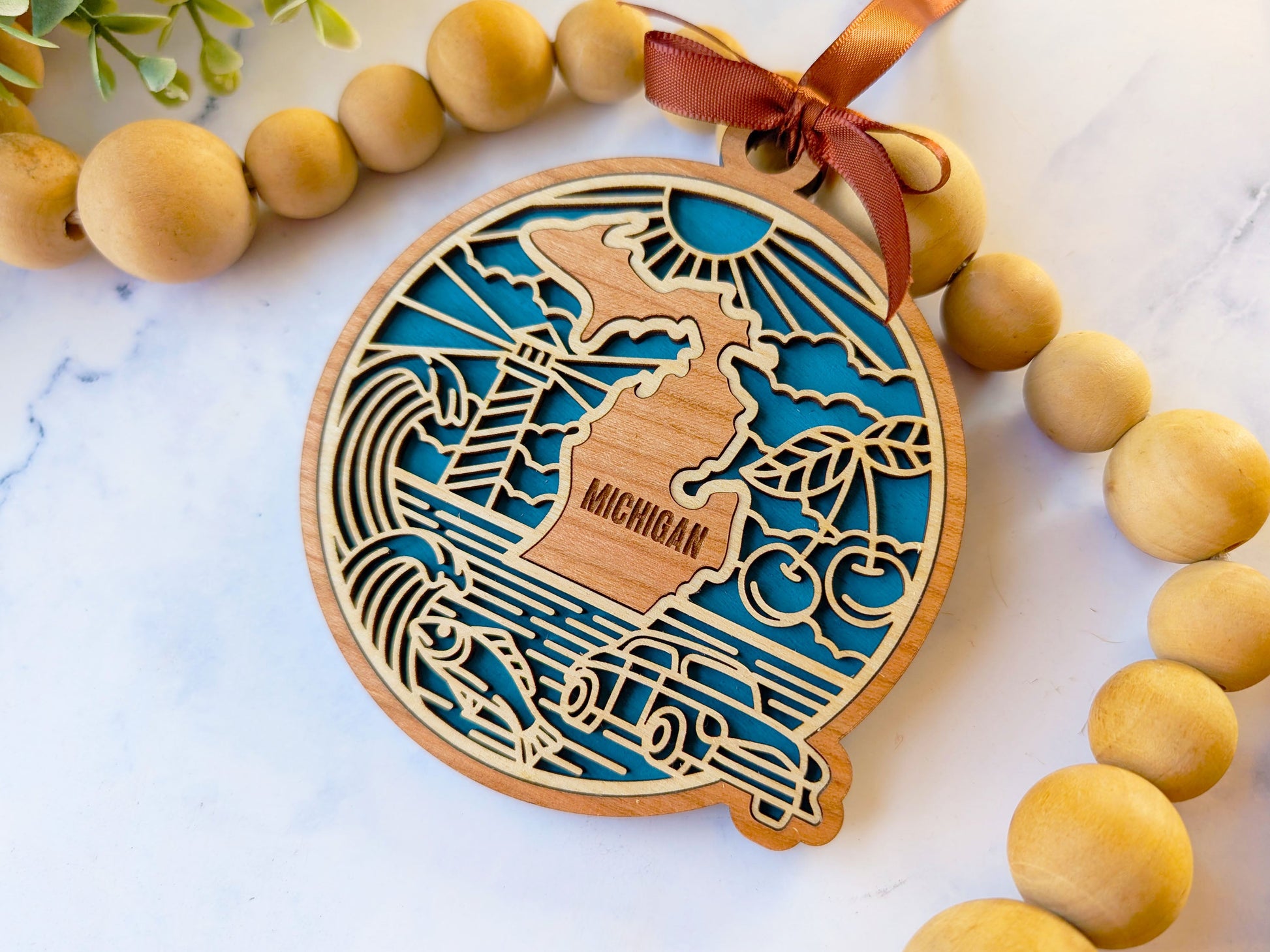 Celebrate Michigan's heritage with this stunning handcrafted wooden ornament. Each piece features intricate details capturing the state's culture, history, and topography . These premium keepsakes transform cherished travel memories into beautiful display pieces that are perfect to display or gift.