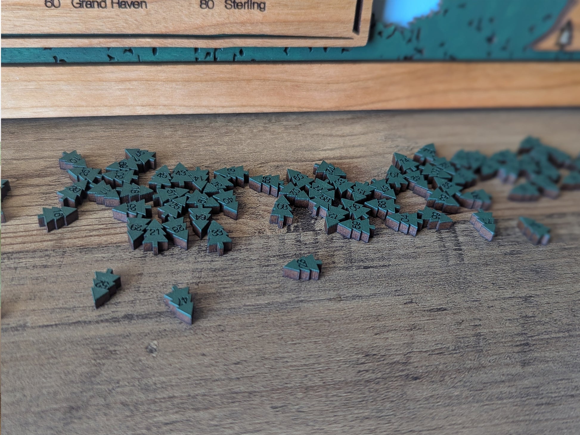 • Cherry wood map of Michigan featuring all 80 State Parks, a map key featuring your personalized name or phrase, and a cherry frame. Finished with a protective coating to ensure lasting beauty for years of adventure tracking