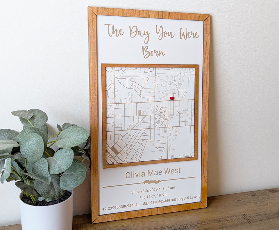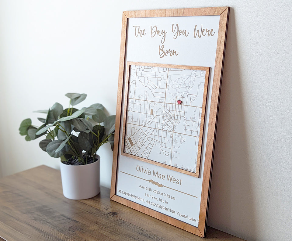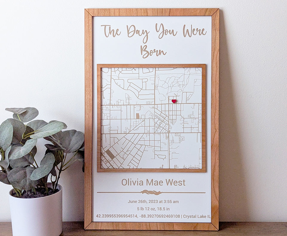 Our milestone street map series allows you to have a custom piece of art for every milestone in your life. This handcrafted sign is to meant to remember where your baby was born, complete with custom engraving. Choose from 6 styles, which incorporate different map shapes and fonts. This sign is perfect for the new parents when their baby is born, a unique way to display baby birth stats!
