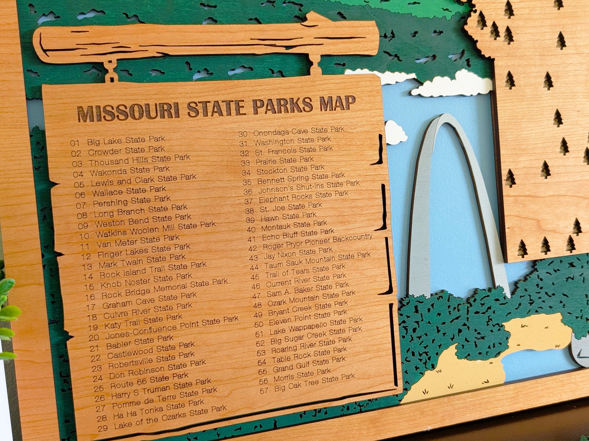 • Cherry wood map of Missouri featuring all 57 state parks, with a cherry frame. Finished with a protective coating to ensure lasting beauty for years of adventure tracking