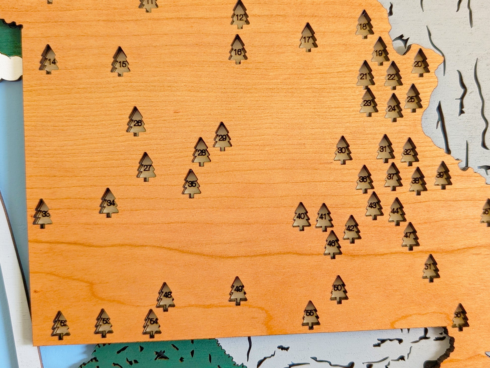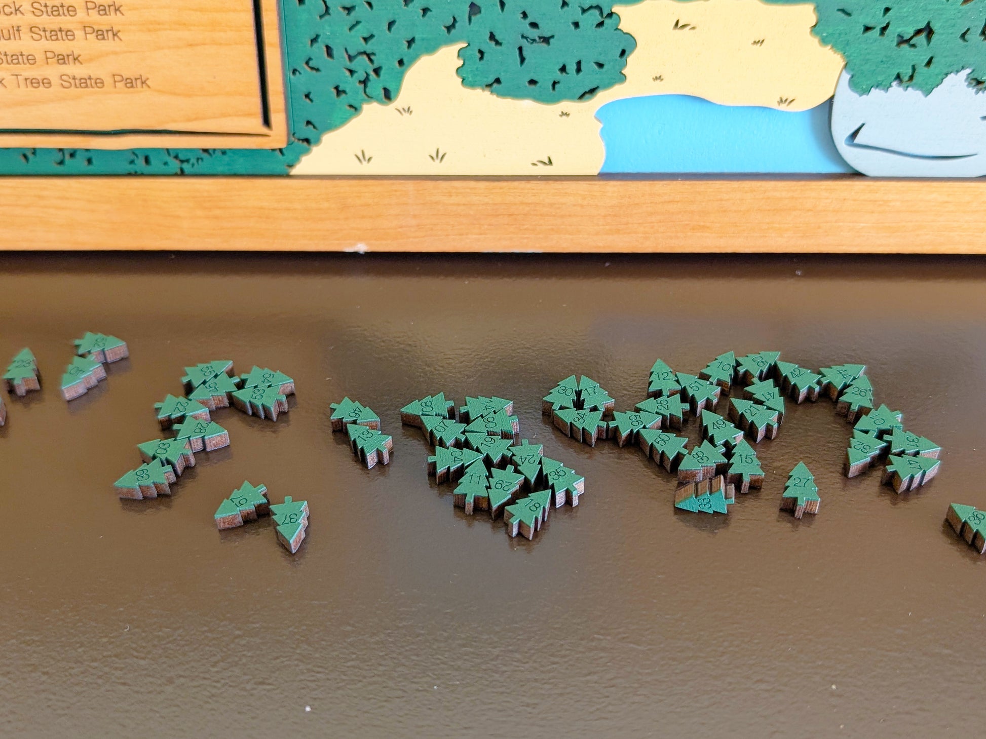 1. Each time you visit a state park, insert a tree marker into the corresponding numbered location (we suggest a dab of super-glue to keep it in place)