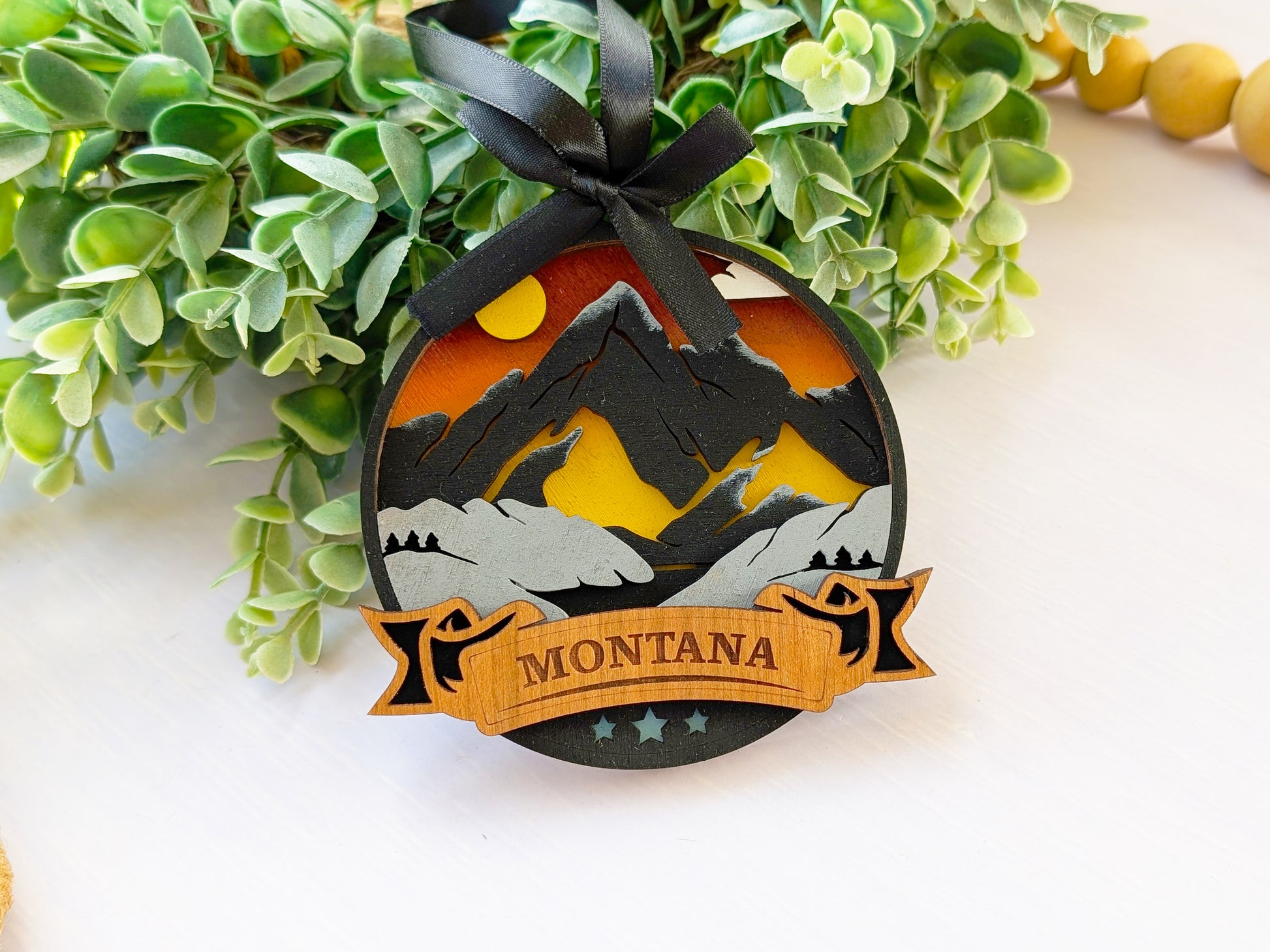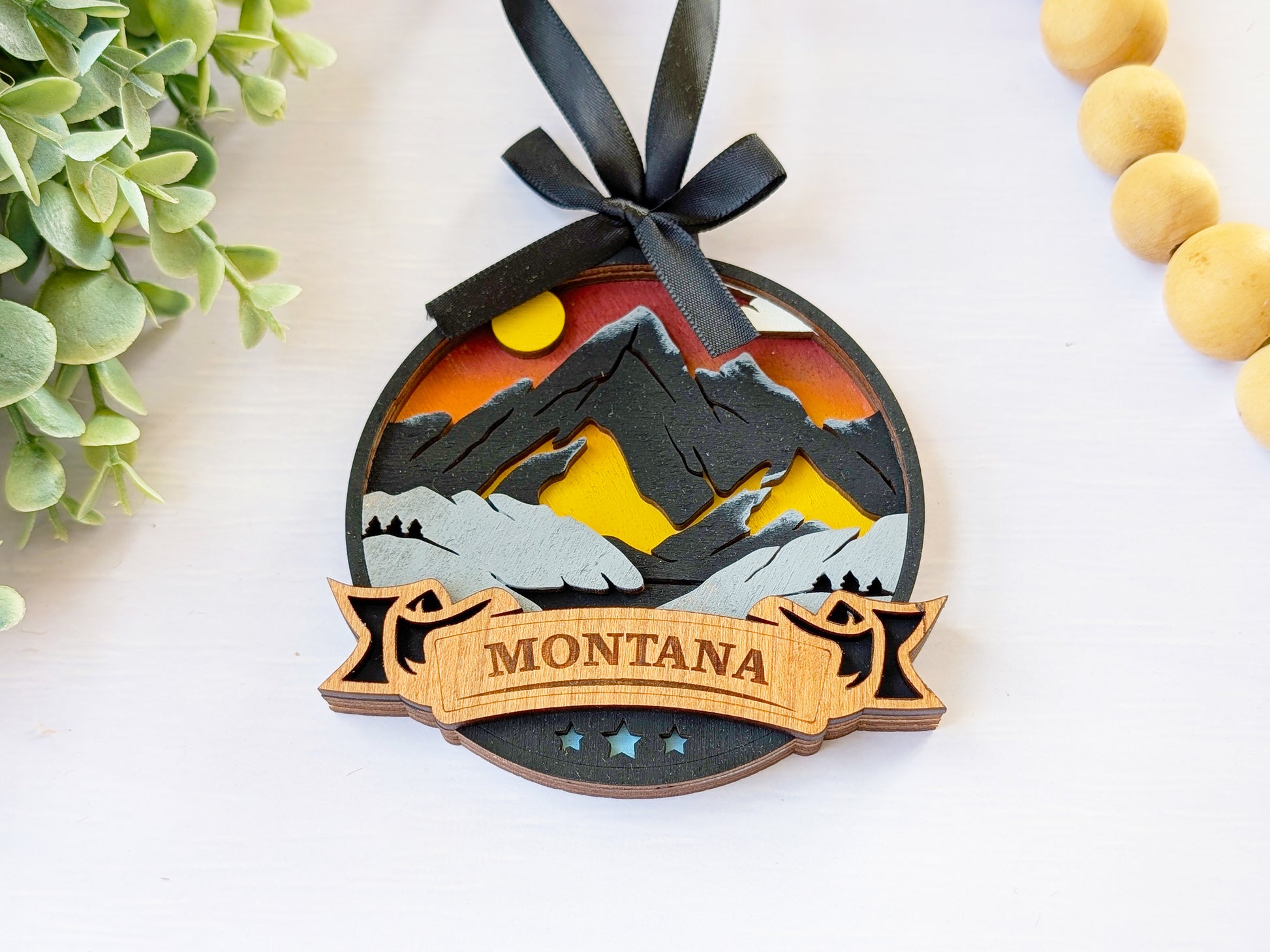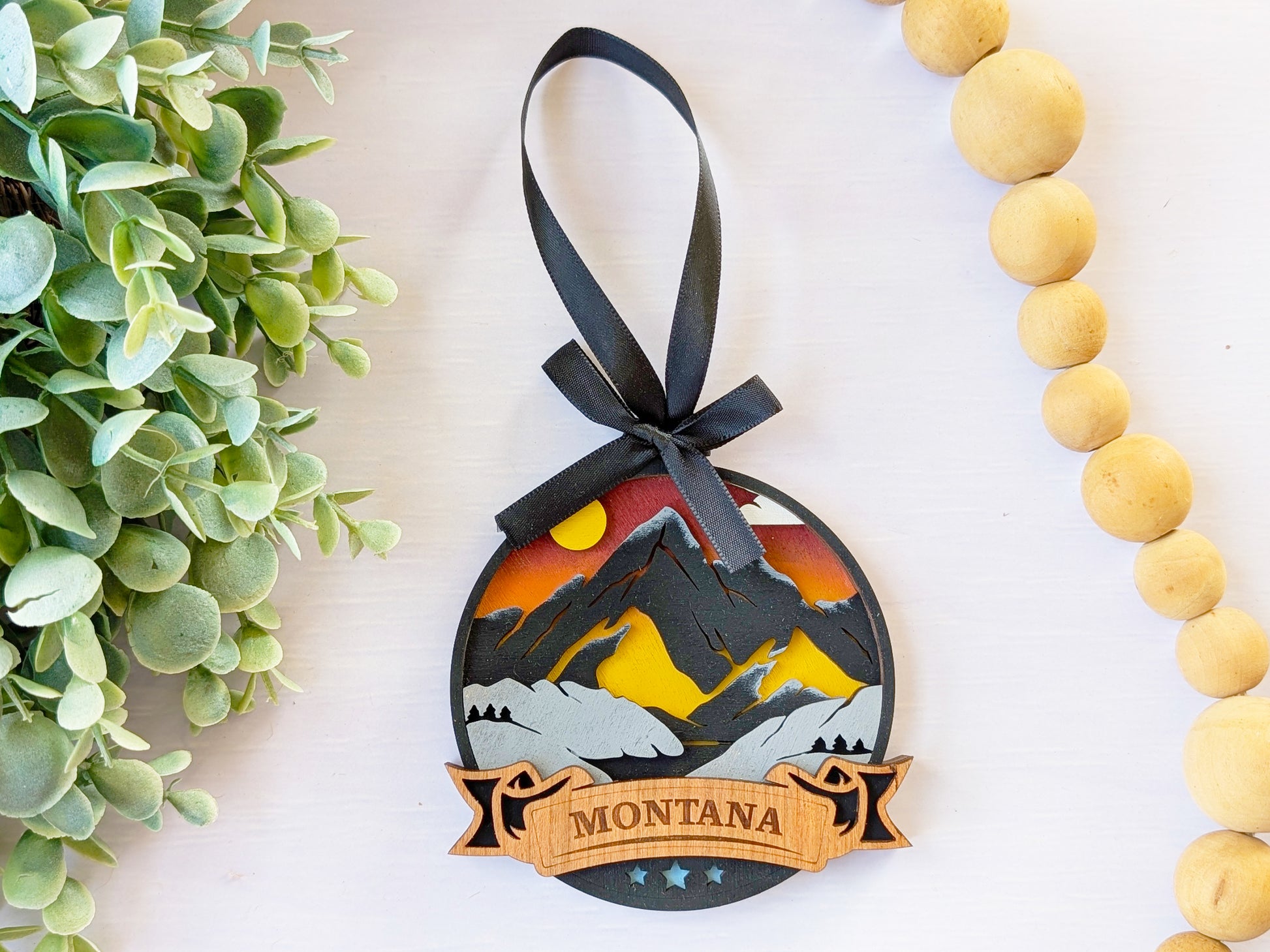 Celebrate Montana with this stunning handcrafted wooden ornament. Each piece features hand-painted details capturing Montana's majestic mountains and big sky country, paired with precision laser-cut and engraved cherry wood showcasing iconic imagery and authentic Montana landmarks. These premium keepsakes transform cherished travel memories into beautiful display pieces that customers love to collect and gift.