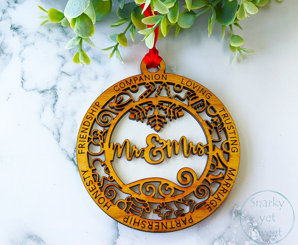 Mr & Mrs layered ornament, spouse ornament, wedding ornament, personalized ornament, unique wood ornament, laser cut ornament, new couple