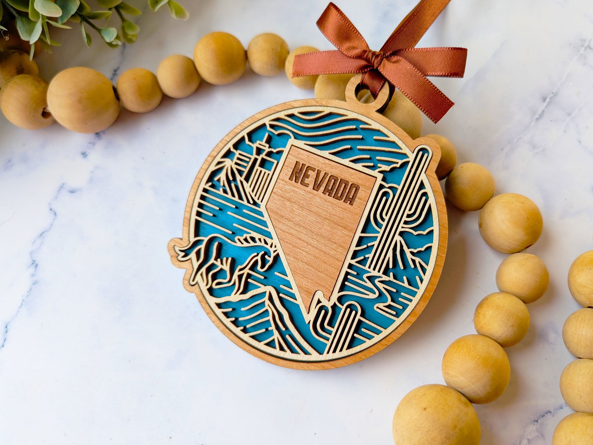 Celebrate Nevada's heritage with this stunning handcrafted wooden ornament. Each piece features intricate details capturing the state's culture, history, and topography . These premium keepsakes transform cherished travel memories into beautiful display pieces that are perfect to display or gift.