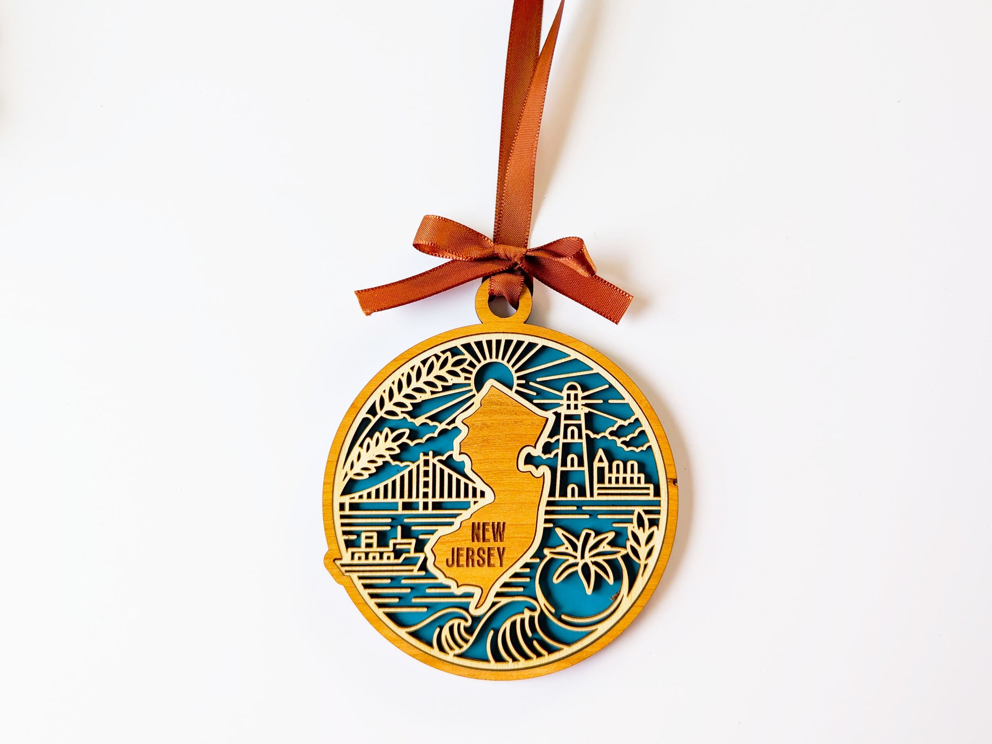 Celebrate New Jersey's heritage with this stunning handcrafted wooden ornament. Each piece features intricate details capturing the state's culture, history, and topography . These premium keepsakes transform cherished travel memories into beautiful display pieces that are perfect to display or gift.