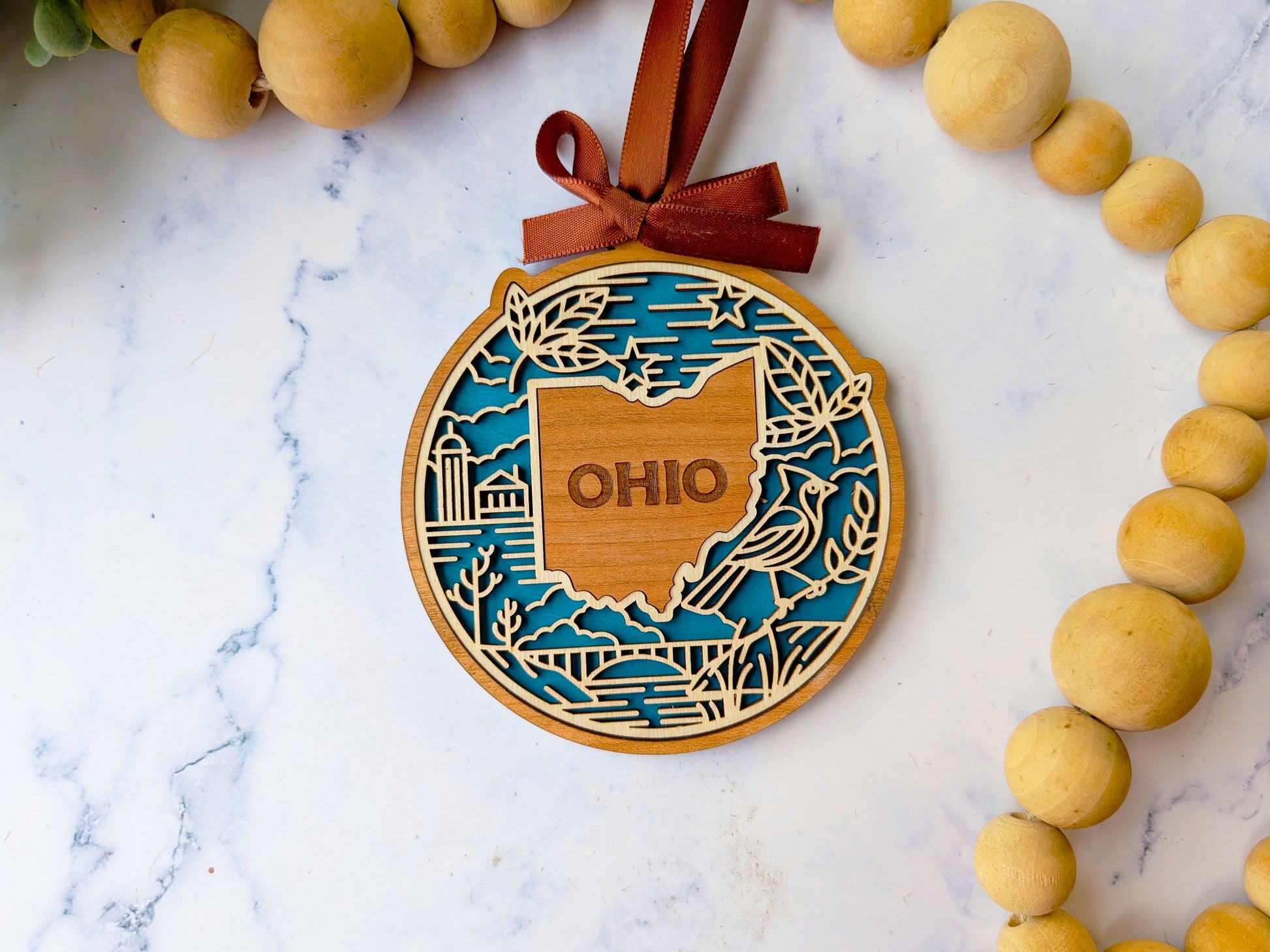 Celebrate Ohio's heritage with this stunning handcrafted wooden ornament. Each piece features intricate details capturing the state's culture, history, and topography . These premium keepsakes transform cherished travel memories into beautiful display pieces that are perfect to display or gift.