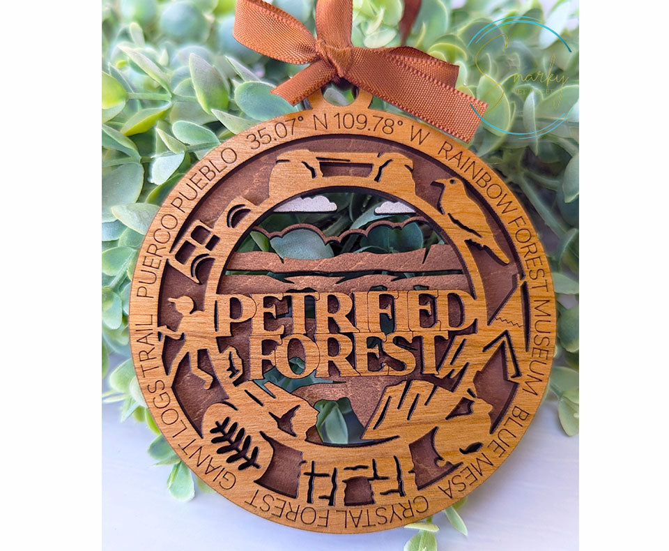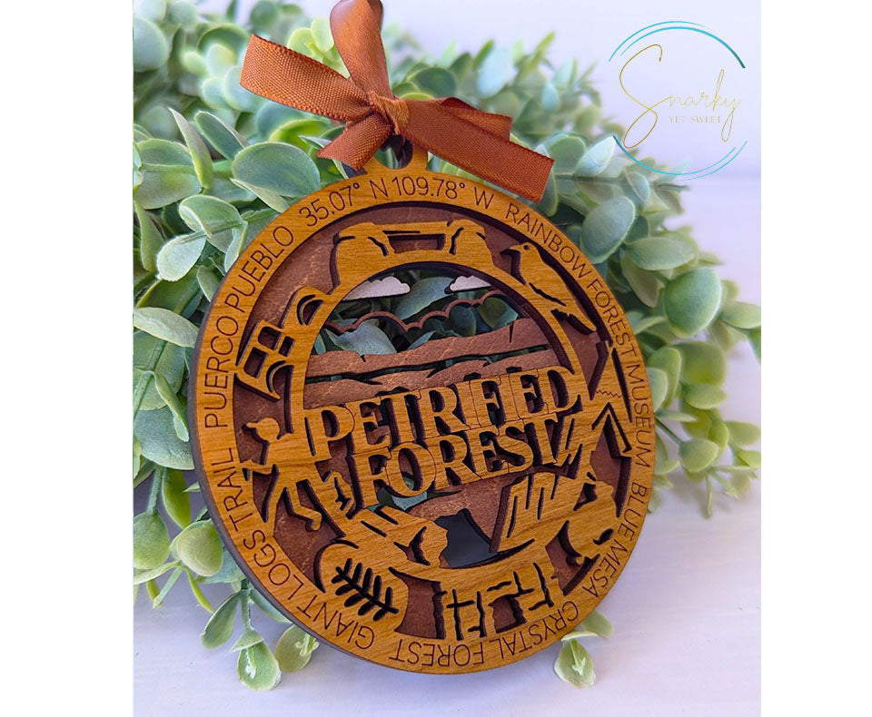 Relive your favorite trip to Petrified Forest National Park with this beautiful handmade wood ornament. Ornaments are hand painted with details from the park and a gorgeous laser cut and engraved cherry wood that features many icons specific to Petrified Forest and words and phrases for that park. These ornaments are great reminders of your favorite family vacation or hiking adventure and make great gifts for the avid hiker or adventurer in your life.