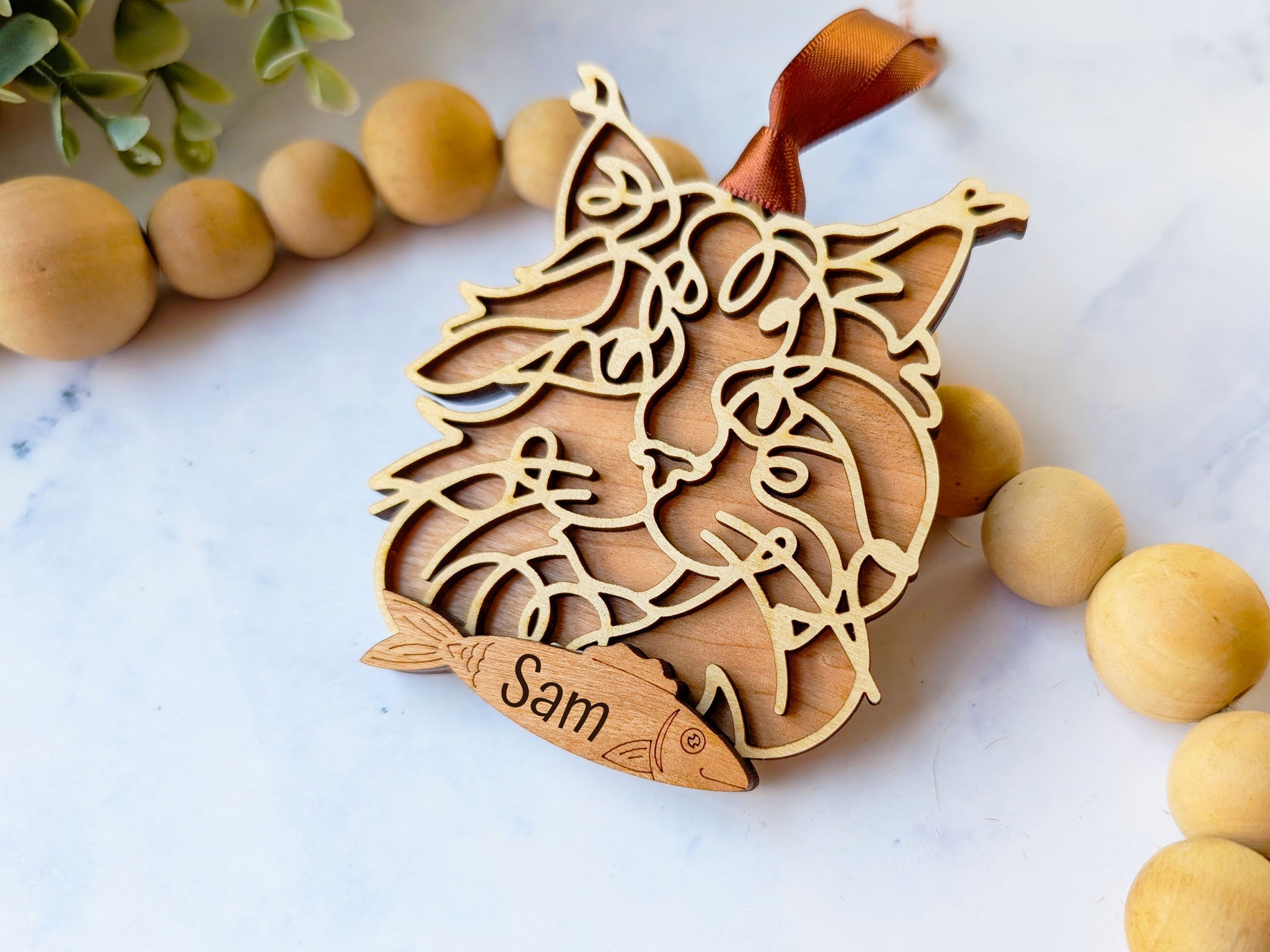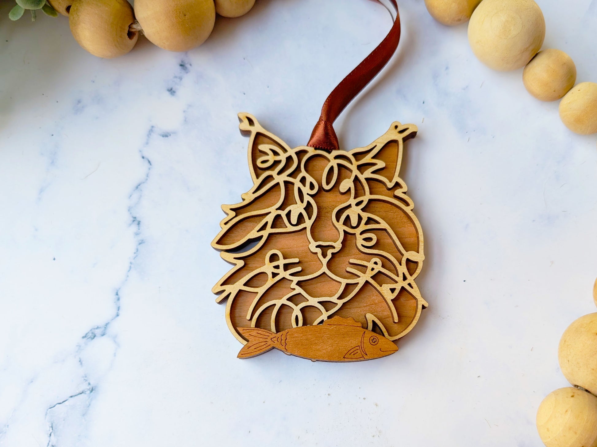 Celebrate your favorite furry friend with this handcrafted wooden cat ornament. Each piece features an intricately layered design that captures your cat’s personality in warm cherry and birch woods. Whether displayed year-round or hung proudly during the holidays, these keepsakes make a heartfelt gift for pet lovers and proud cat parents alike.