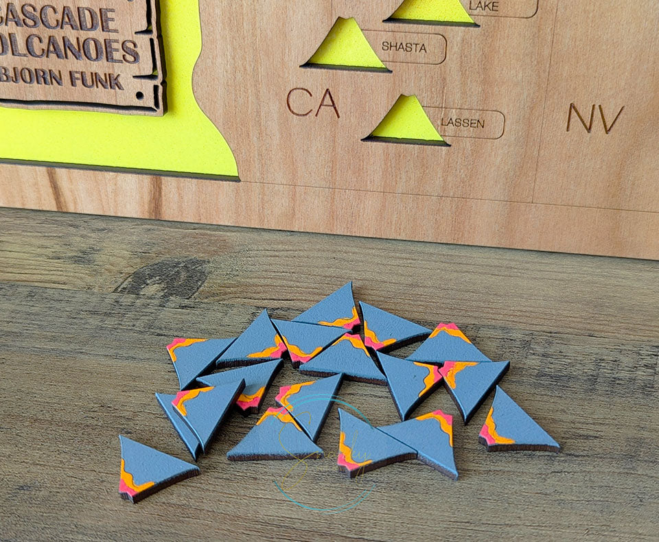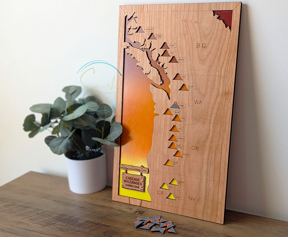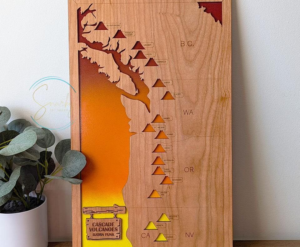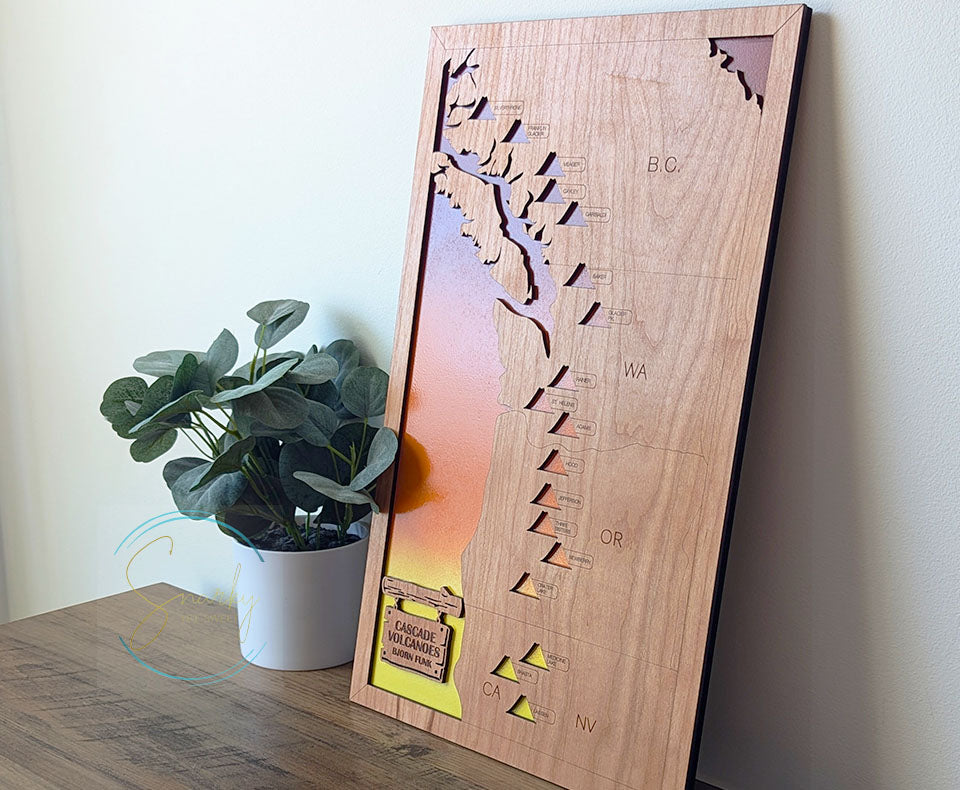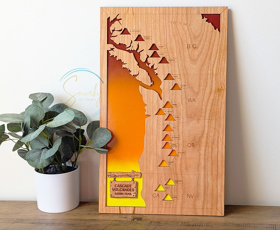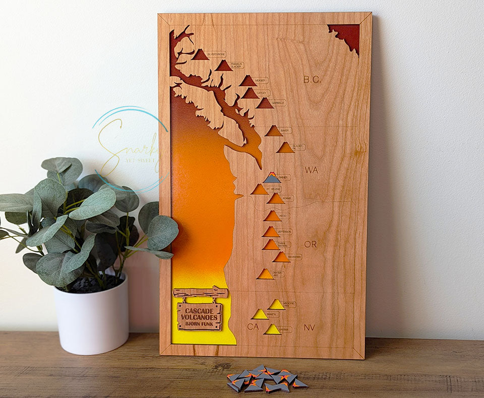 This beautiful map features the US and Canadian volcanos as part of the ring of fire. If you are an avid hiker that is trying to hit all of these magnificent volcanos, this is the map to track your adventure. Featuring 18 amazing peaks throughout California, Oregon, Washington and British Columbia, enjoy placing these hand painted volcano pieces after each one you visit. Perfect for any great hiker in your life!