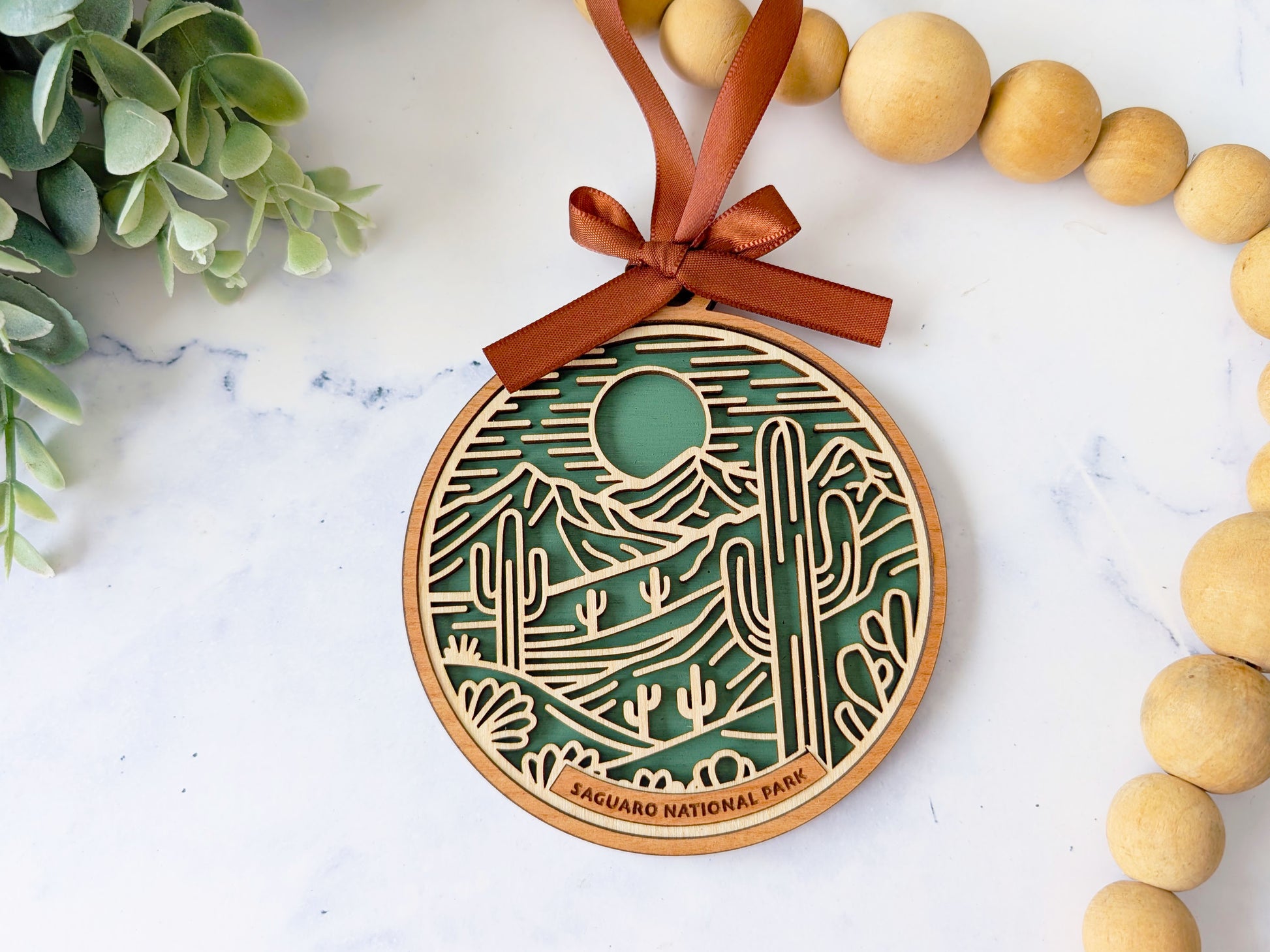 Relive your favorite trip to Saguaro National Park with this beautiful handmade wood ornament. Ornaments are hand painted with details from the park and a gorgeous laser cut and engraved cherry wood that features many icons specific to Saguaro. These ornaments are great reminders of your favorite family vacation or hiking adventure and make great gifts for the avid hiker or adventurer in your life.