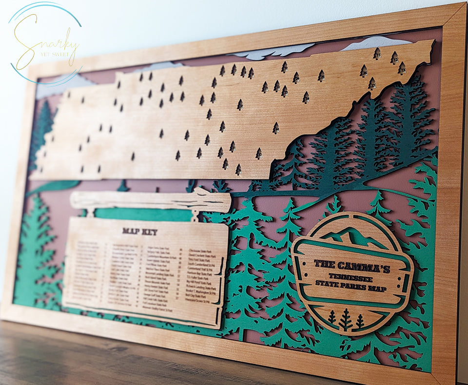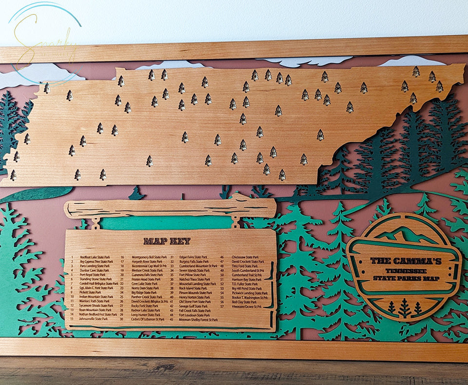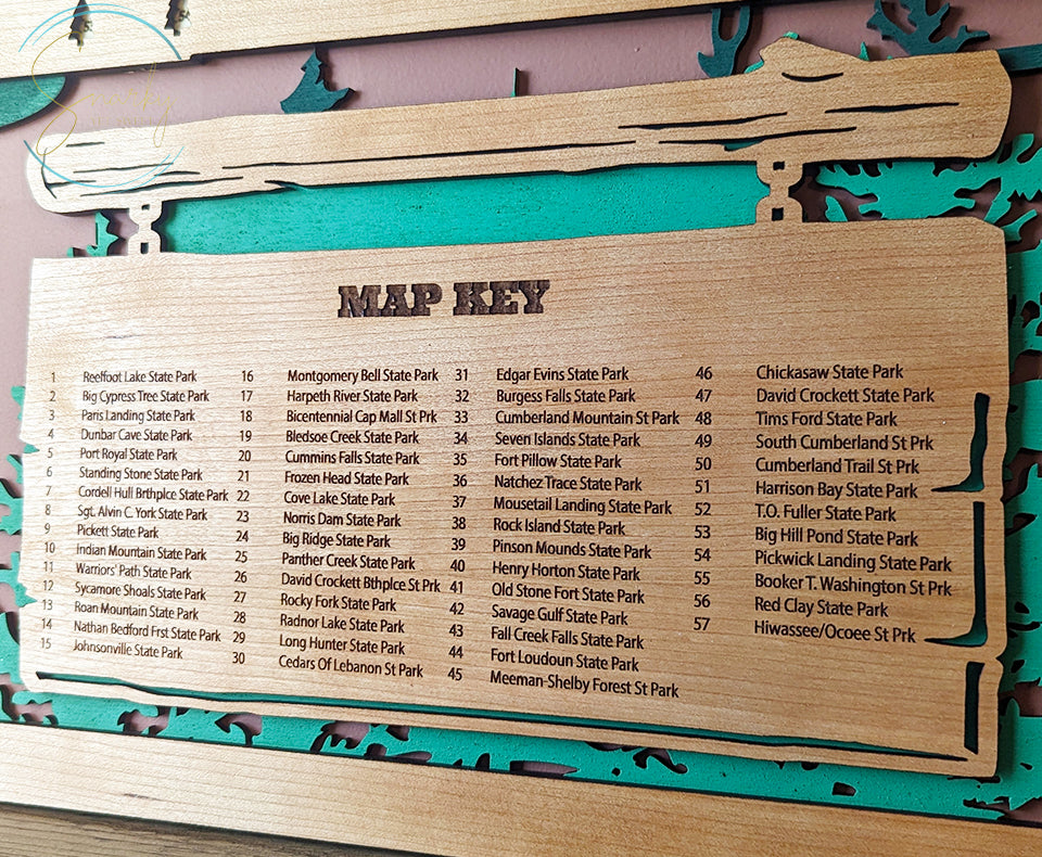 • Cherry wood map of Tennessee featuring all 50 State Parks, a map key featuring your personalized name or phrase, and a cherry frame. Finished with a protective coating to ensure lasting beauty for years of adventure tracking