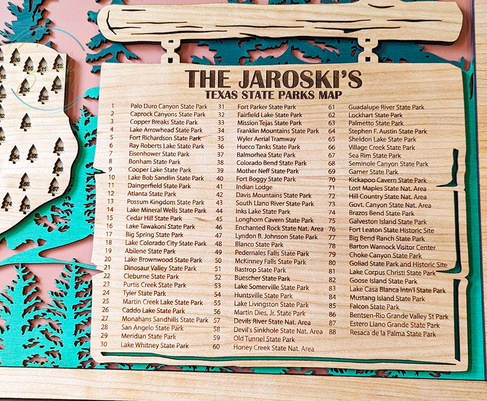 • Cherry wood map of Texas featuring all 50 State Parks, a map key featuring your personalized name or phrase, and a cherry frame. Finished with a protective coating to ensure lasting beauty for years of adventure tracking