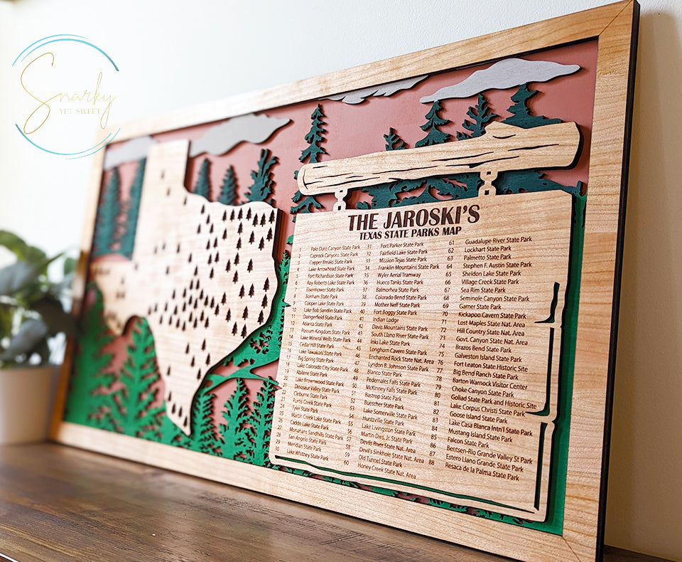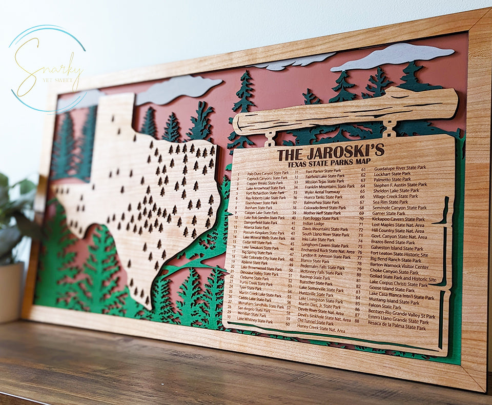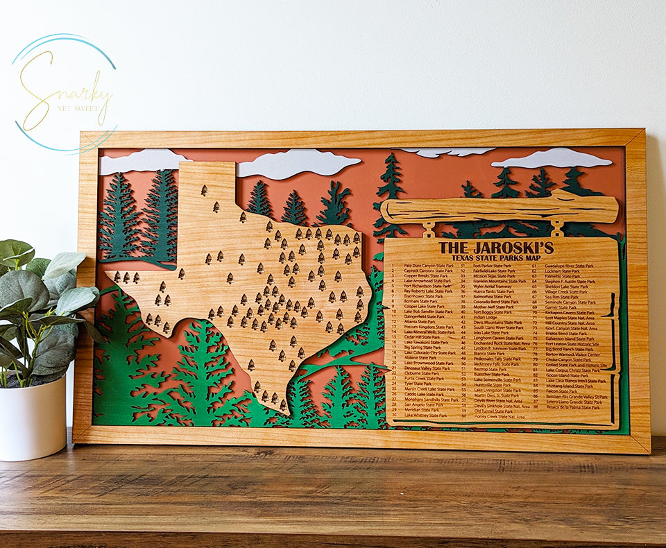 Each Texas Parks Travel Display is handcrafted by our family-owned business in Woodstock, Illinois. When you purchase from Snarky Yet Sweet, you're supporting a small business dedicated to quality craftsmanship and personal service.