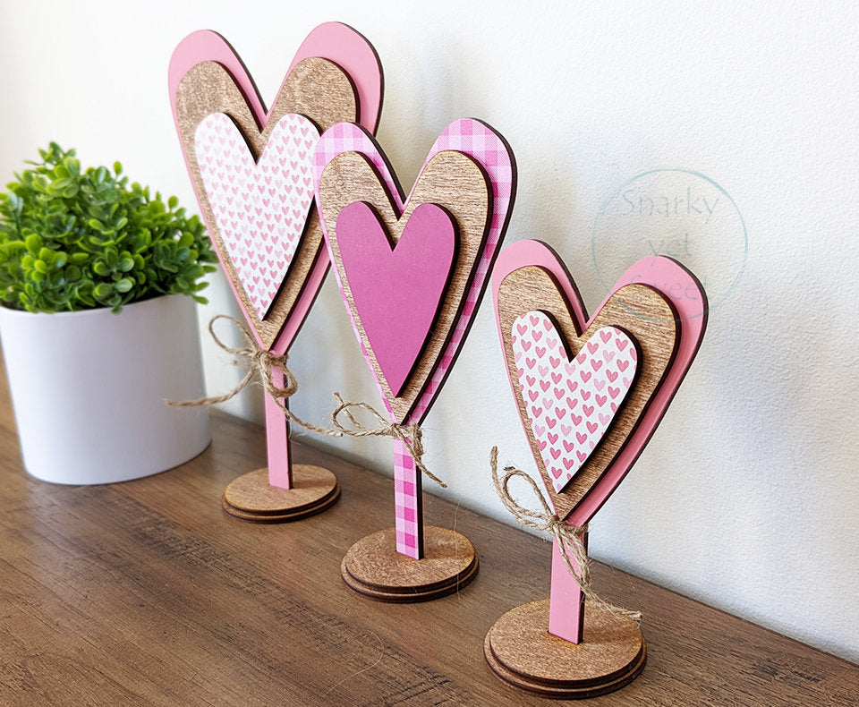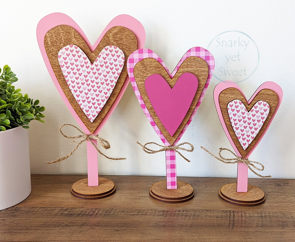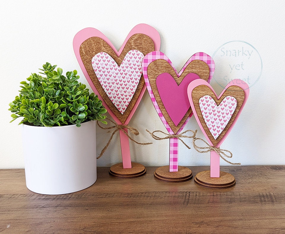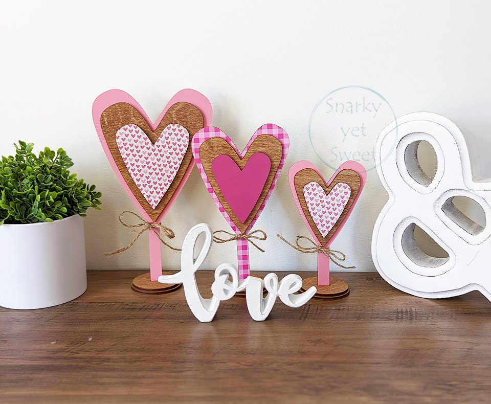 Triple standing hearts home decor, set of 3 standing hearts, Valentine's Day decor, valentines decor, patterned wood hearts, gift for her