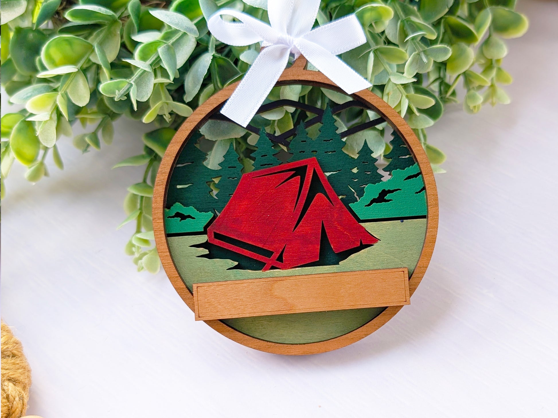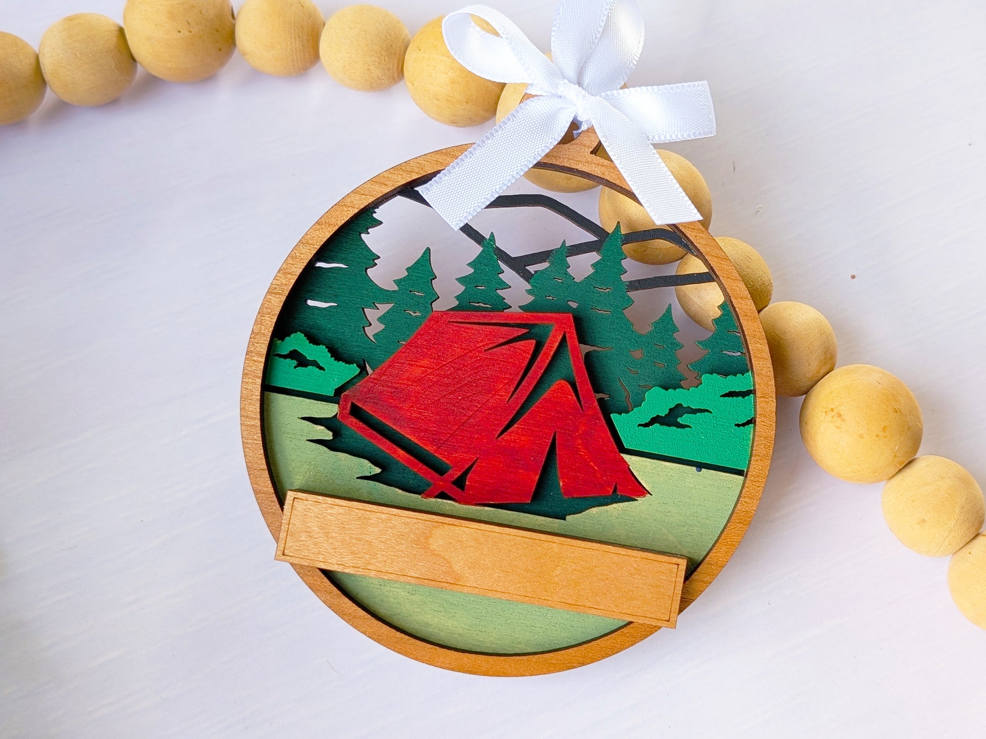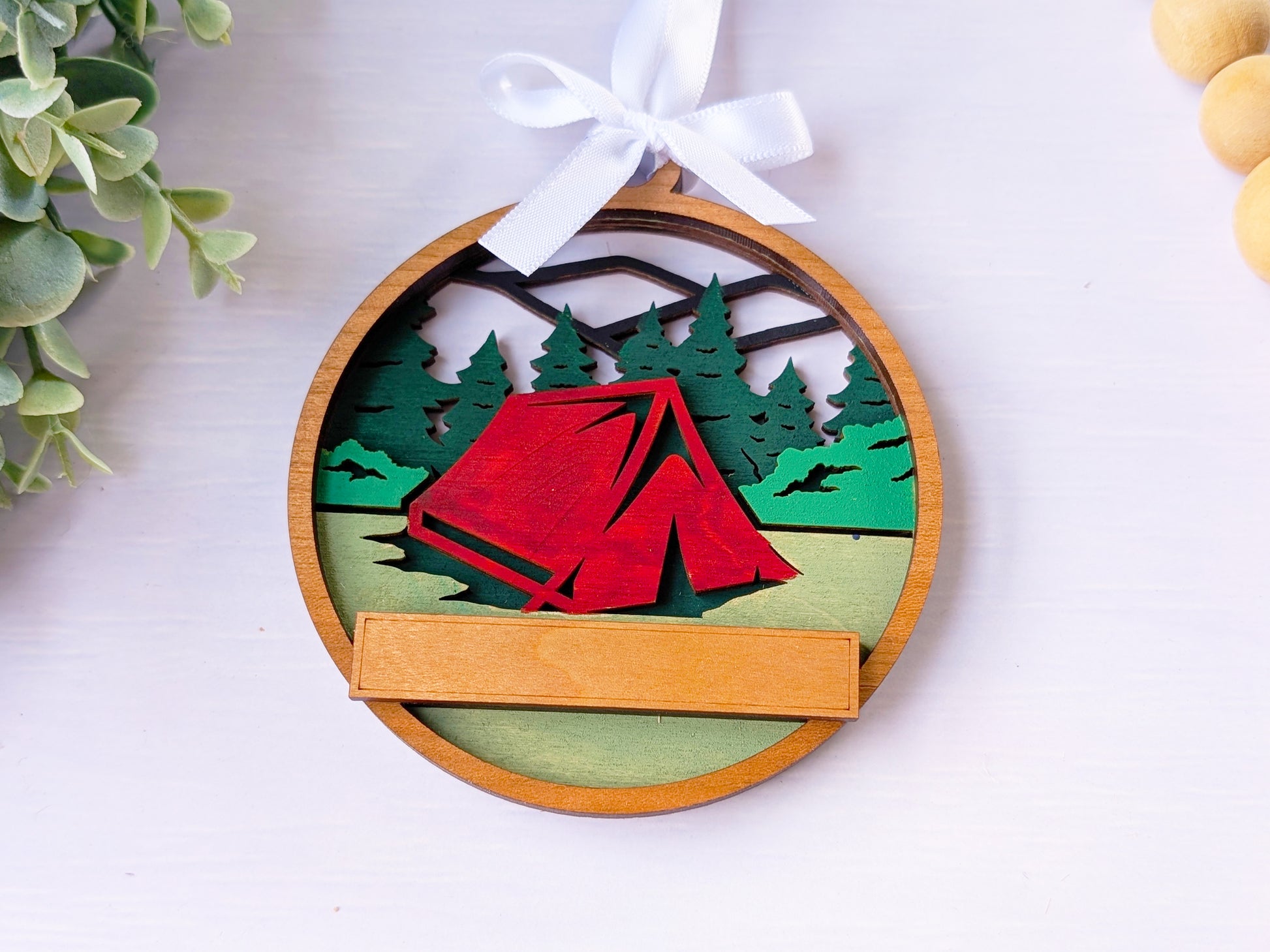 Create the perfect location-specific souvenir with this customizable handcrafted wooden ornament. Each piece features hand-painted camping scenes with tents and mountain vistas, complete with a personalized text banner that can display your shop name, location, or custom message. These versatile ornaments connect customers to their camping memories while promoting your brand, making them ideal for gift shops, visitor centers, and tourist destinations nationwide.