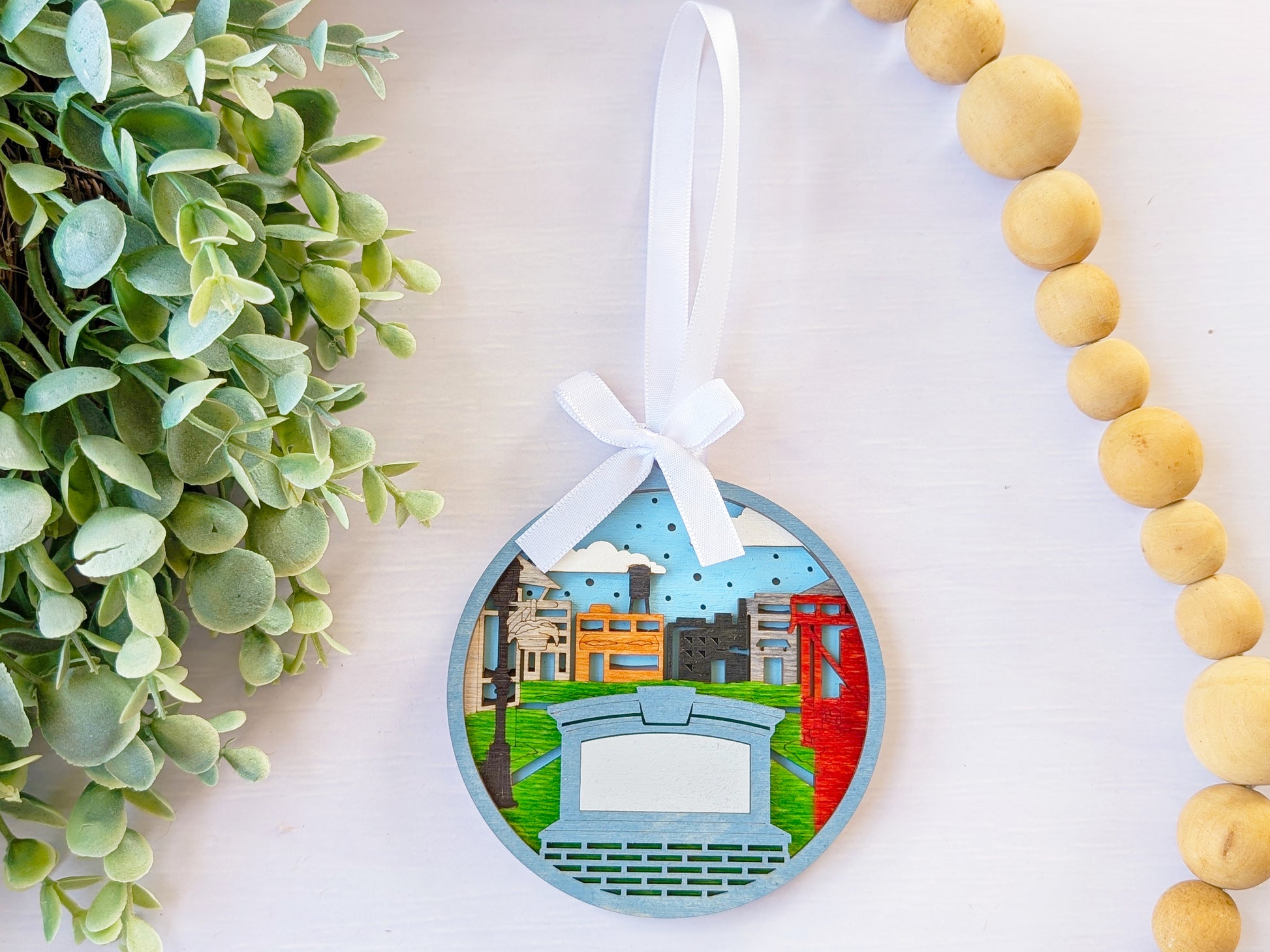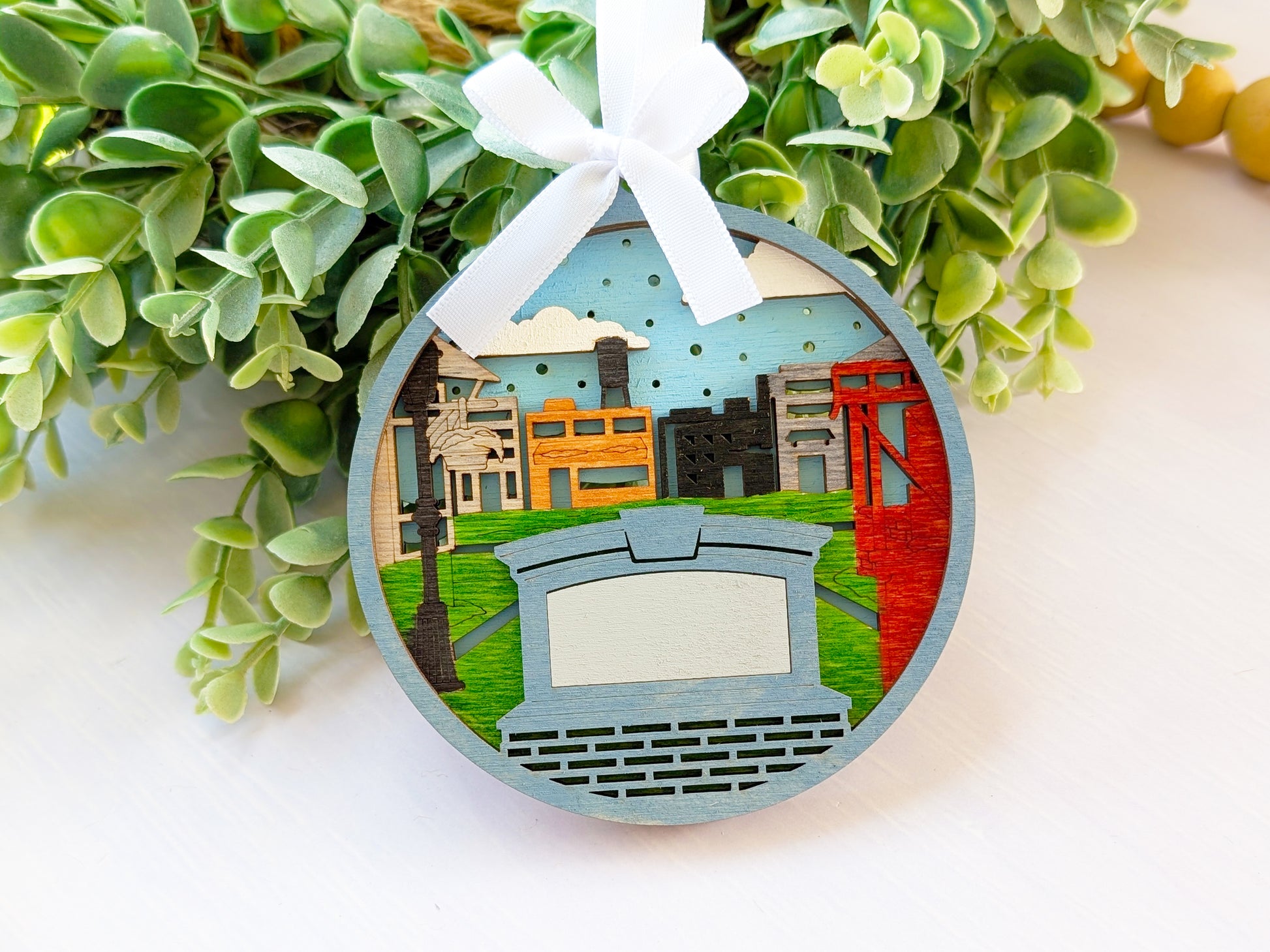 Create the perfect location-specific souvenir with this customizable handcrafted wooden ornament. Each piece features hand-painted downtown streetscapes with historic buildings and storefronts, complete with a personalized text banner that can display your shop name, location, or custom message. These versatile ornaments connect customers to their urban exploration memories while promoting your brand, making them ideal for gift shops, visitor centers, and tourist destinations nationwide.
