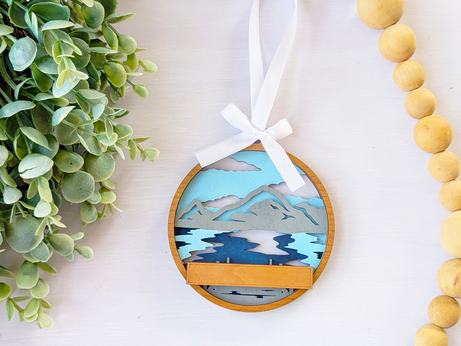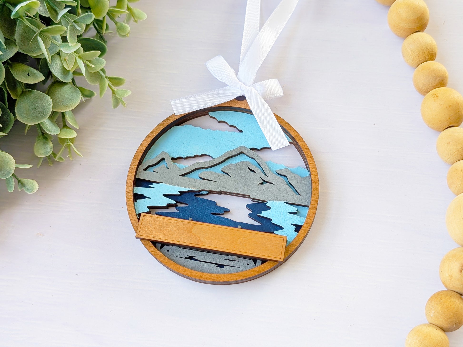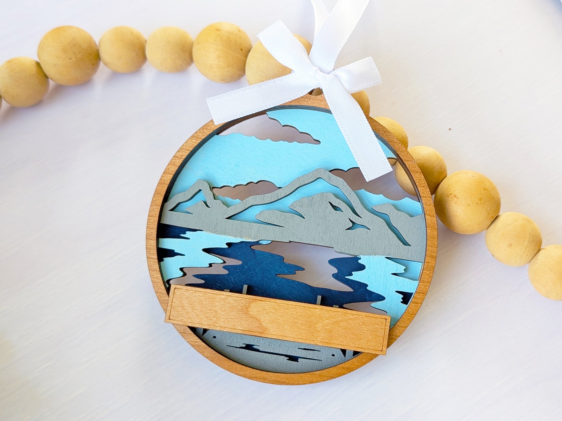 Create the perfect location-specific souvenir with this customizable handcrafted wooden ornament. Each piece features hand-painted mountain lake scenes with pristine waters and snow-capped peaks, complete with a personalized text banner that can display your shop name, location, or custom message. These versatile ornaments connect customers to their alpine adventure memories while promoting your brand, making them ideal for gift shops, visitor centers, and tourist destinations nationwide.