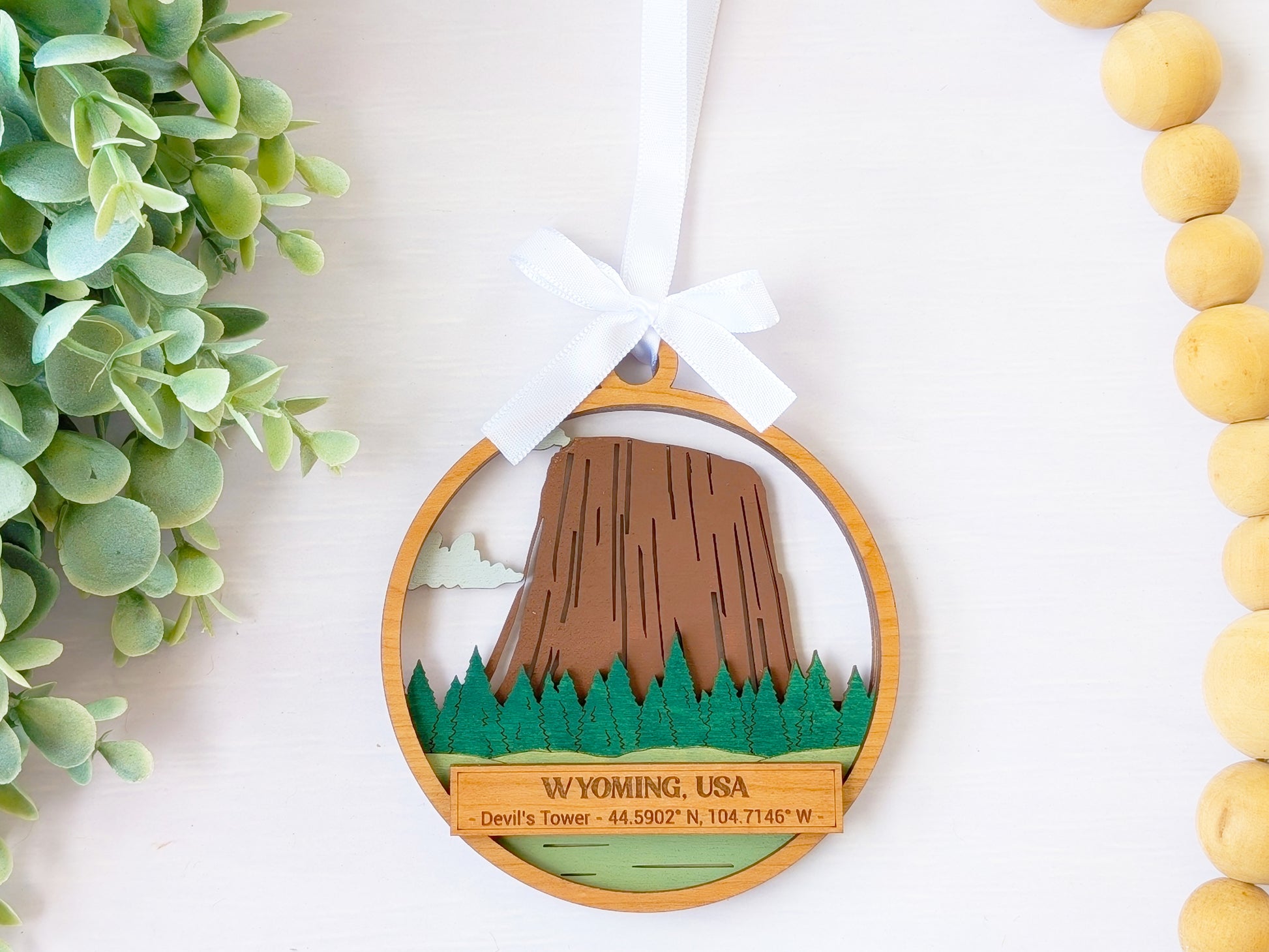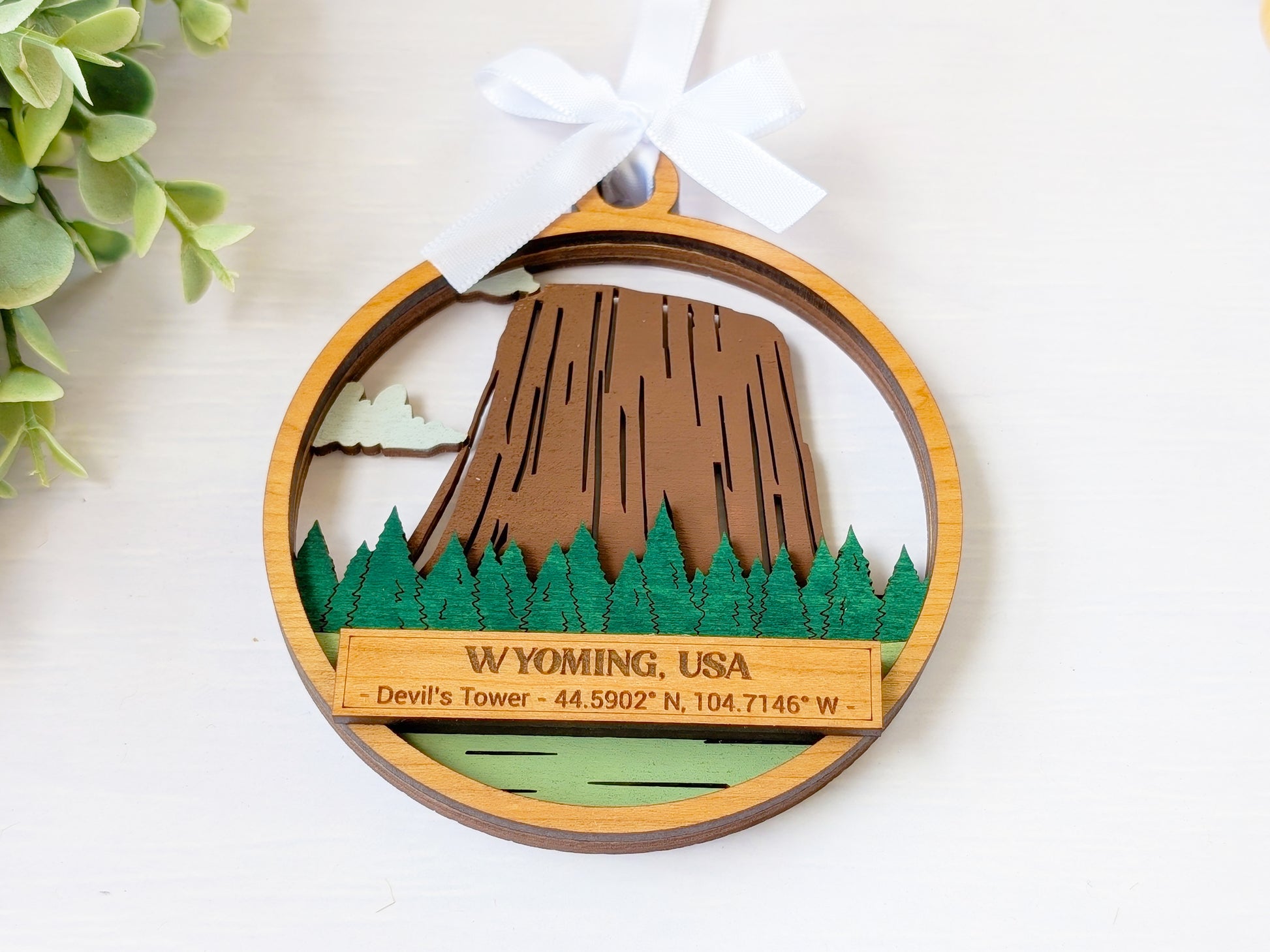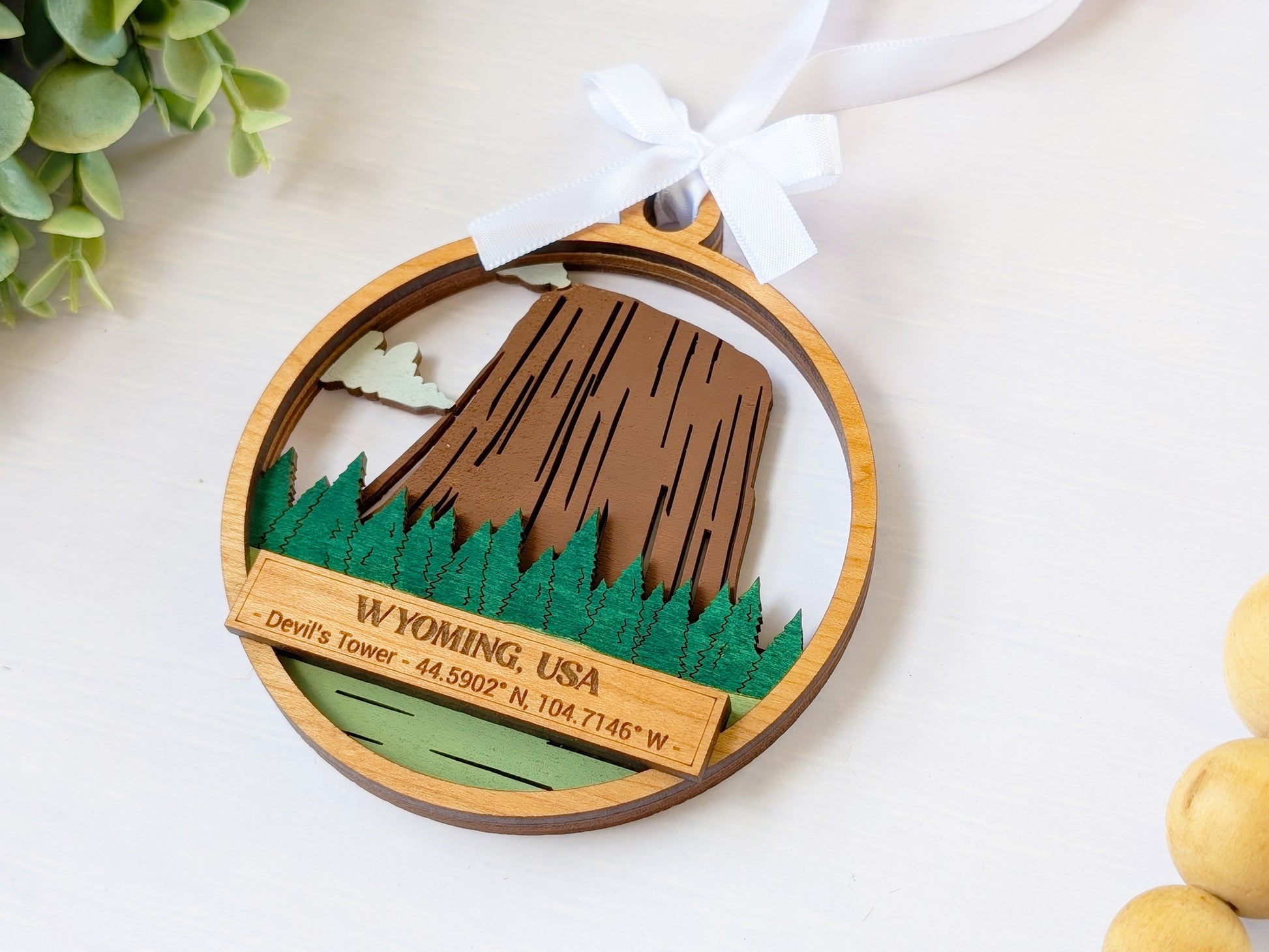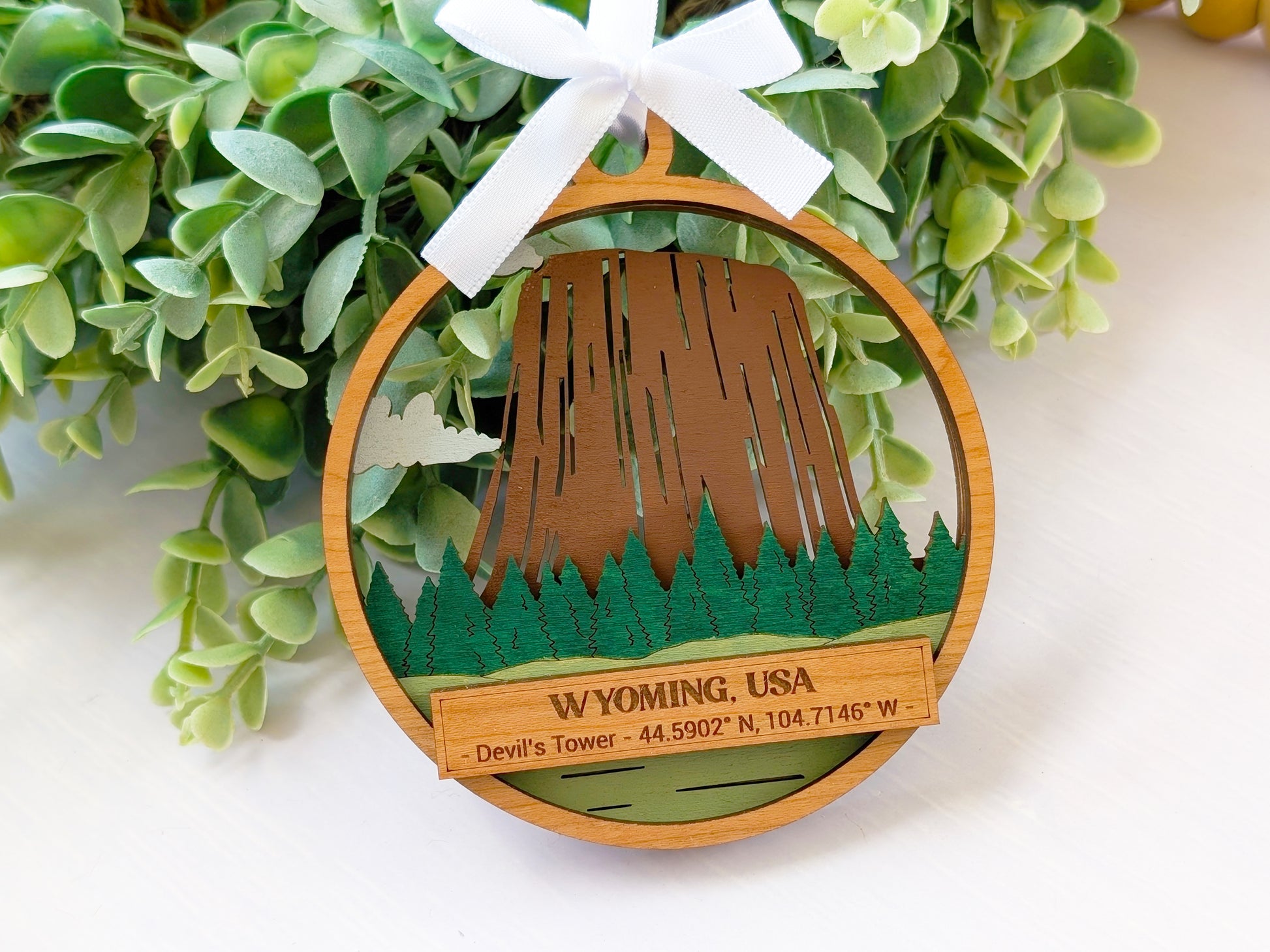 Celebrate Devil's Tower with this stunning handcrafted wooden ornament. Each piece features hand-painted details capturing the dramatic volcanic neck rising from the prairie, paired with precision laser-cut and engraved cherry wood showcasing iconic imagery and authentic monument terminology. These premium keepsakes transform cherished travel memories into beautiful display pieces that customers love to collect and gift.