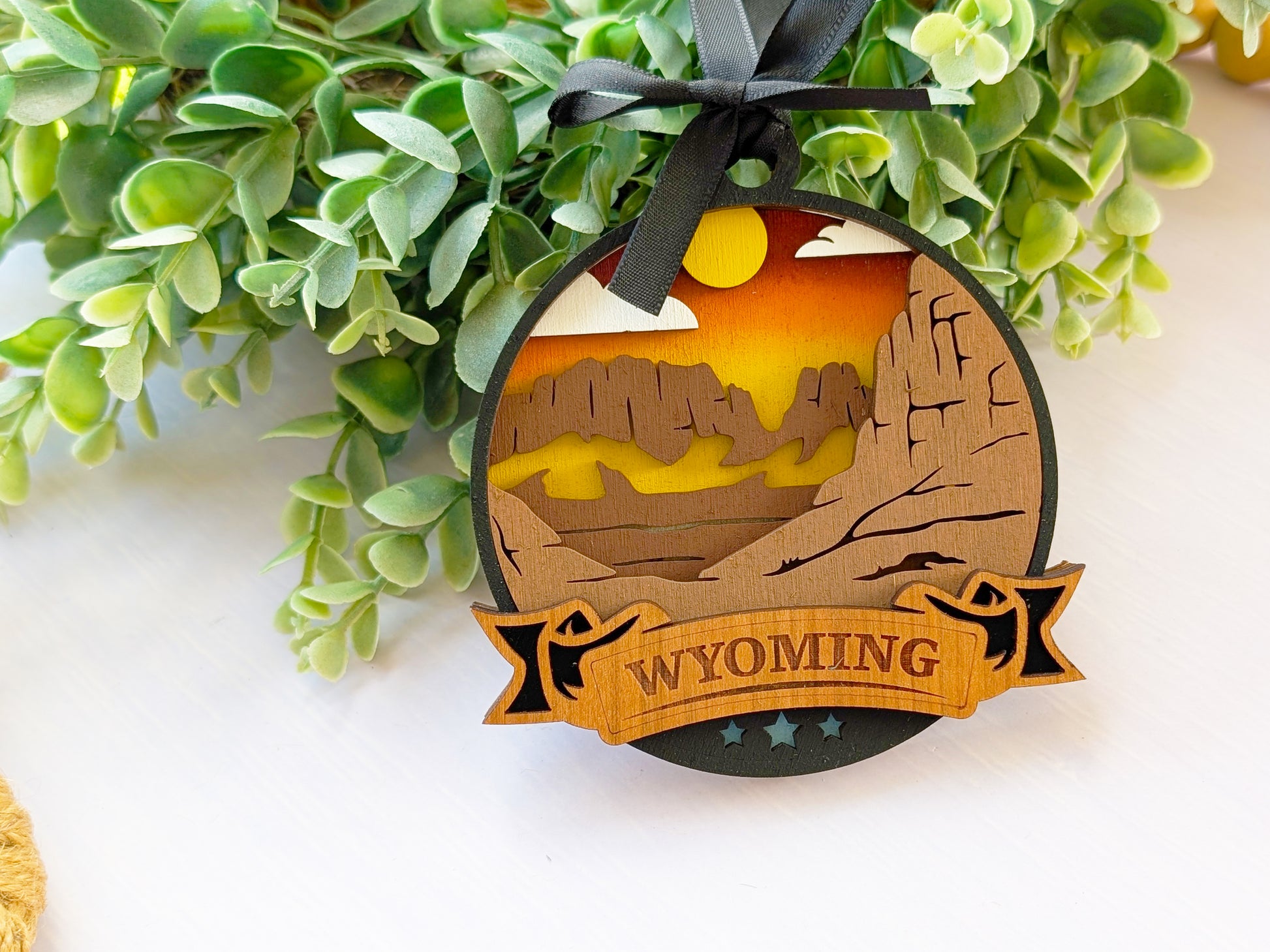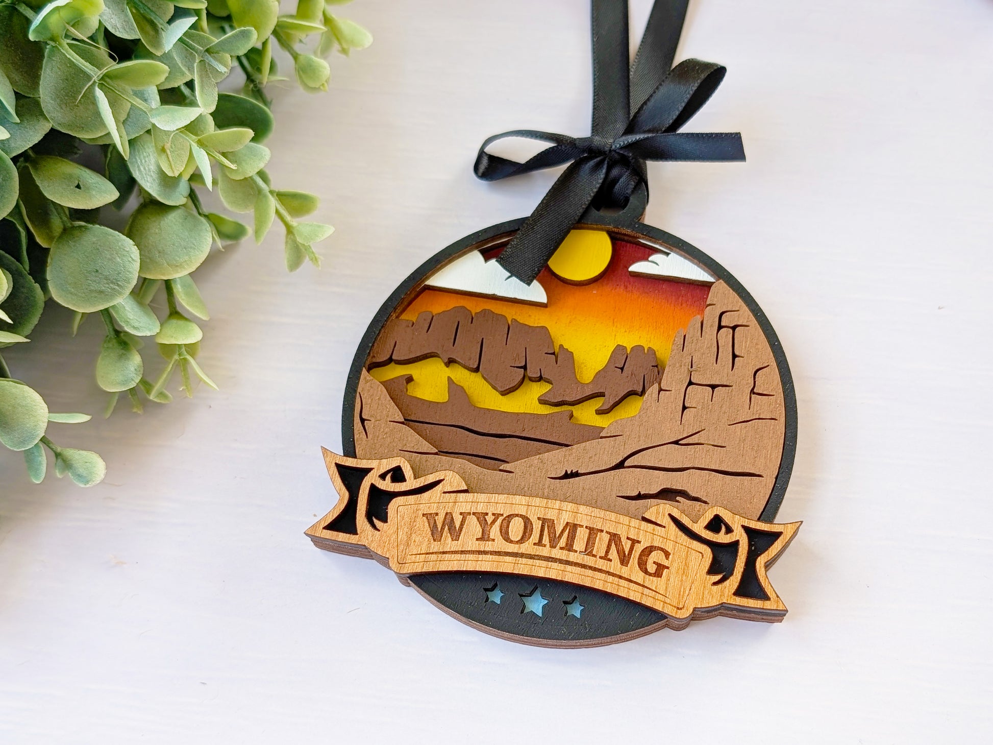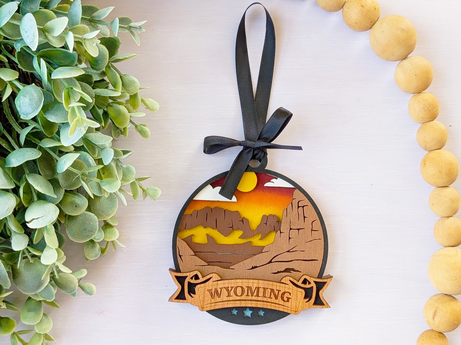 Celebrate Wyoming with this stunning handcrafted wooden ornament. Each piece features hand-painted details capturing Wyoming's iconic western landscapes and natural wonders, paired with precision laser-cut and engraved cherry wood showcasing iconic imagery and authentic Wyoming landmarks. These premium keepsakes transform cherished travel memories into beautiful display pieces that customers love to collect and gift.