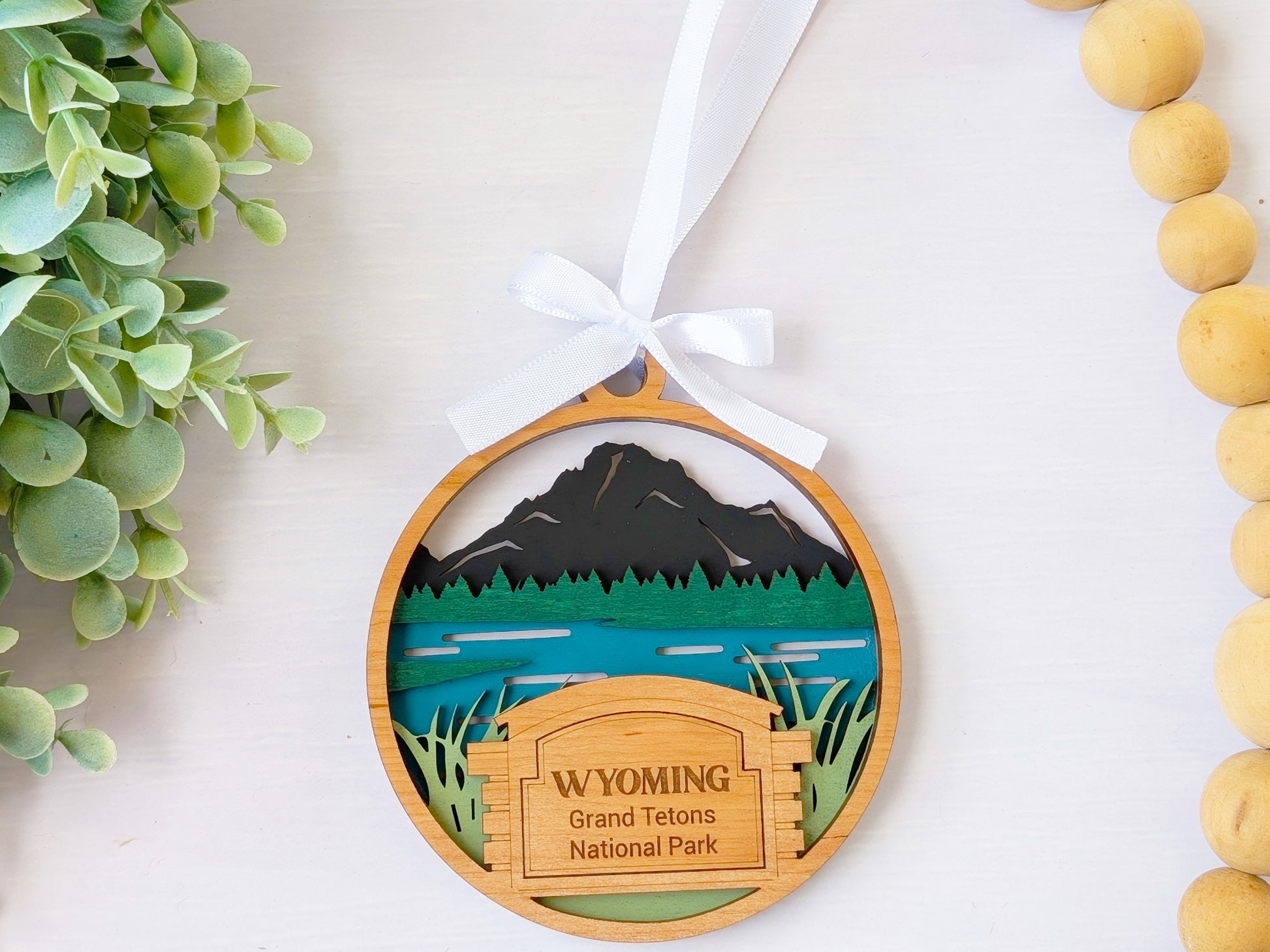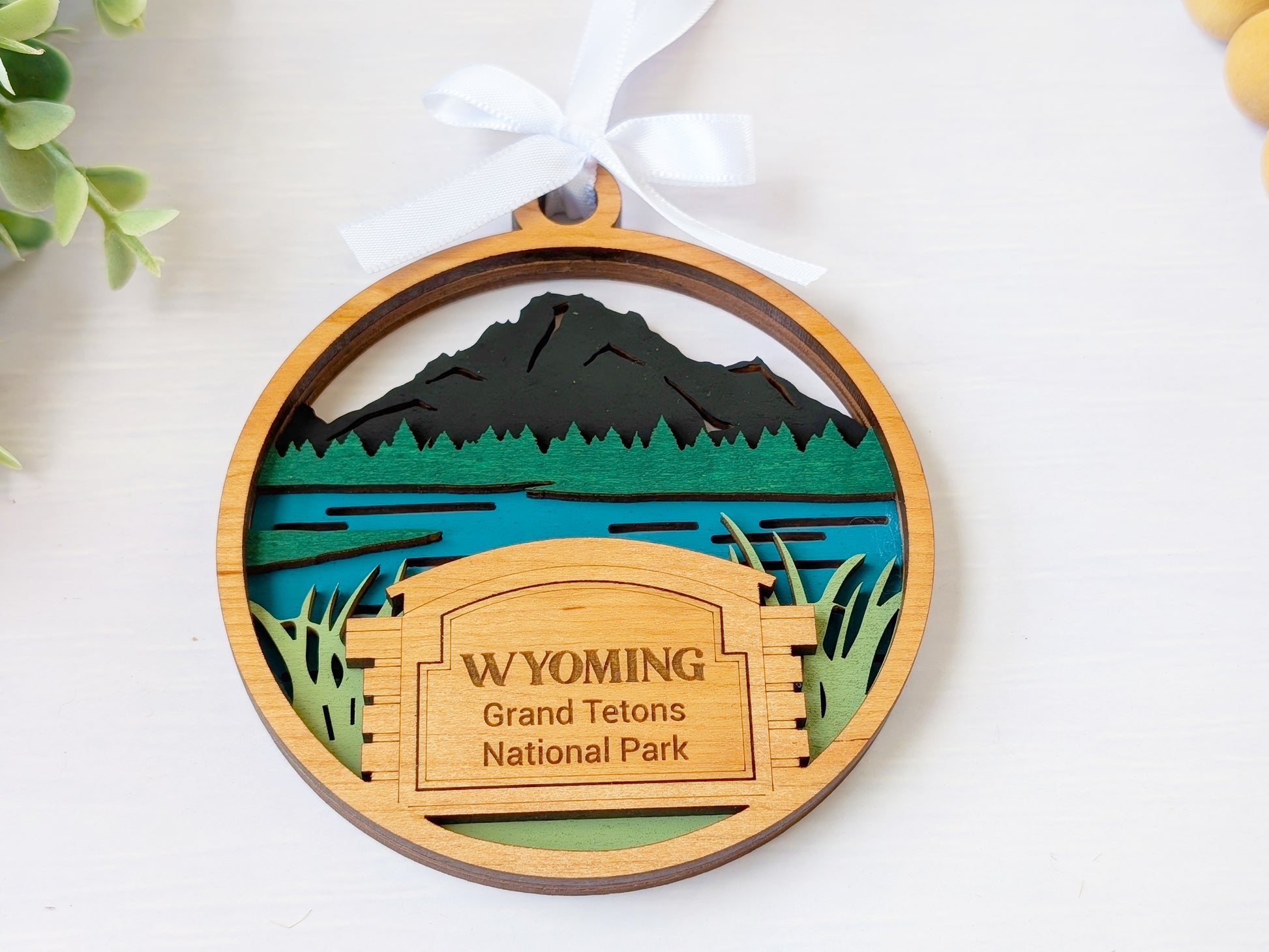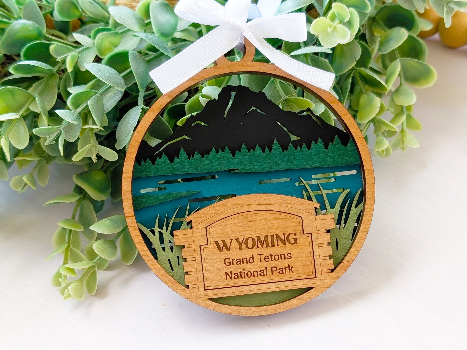 Celebrate Grand Teton National Park with this stunning handcrafted wooden ornament. Each piece features hand-painted details capturing the dramatic Teton Range and pristine alpine lakes, paired with precision laser-cut and engraved cherry wood showcasing iconic imagery and authentic park terminology. These premium keepsakes transform cherished travel memories into beautiful display pieces that customers love to collect and gift.