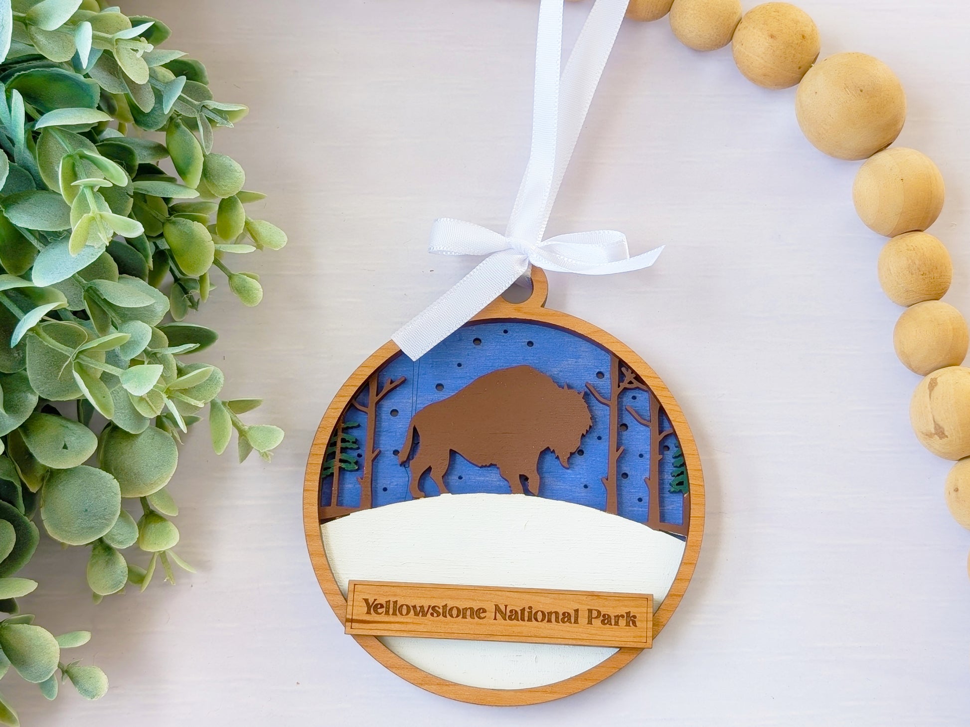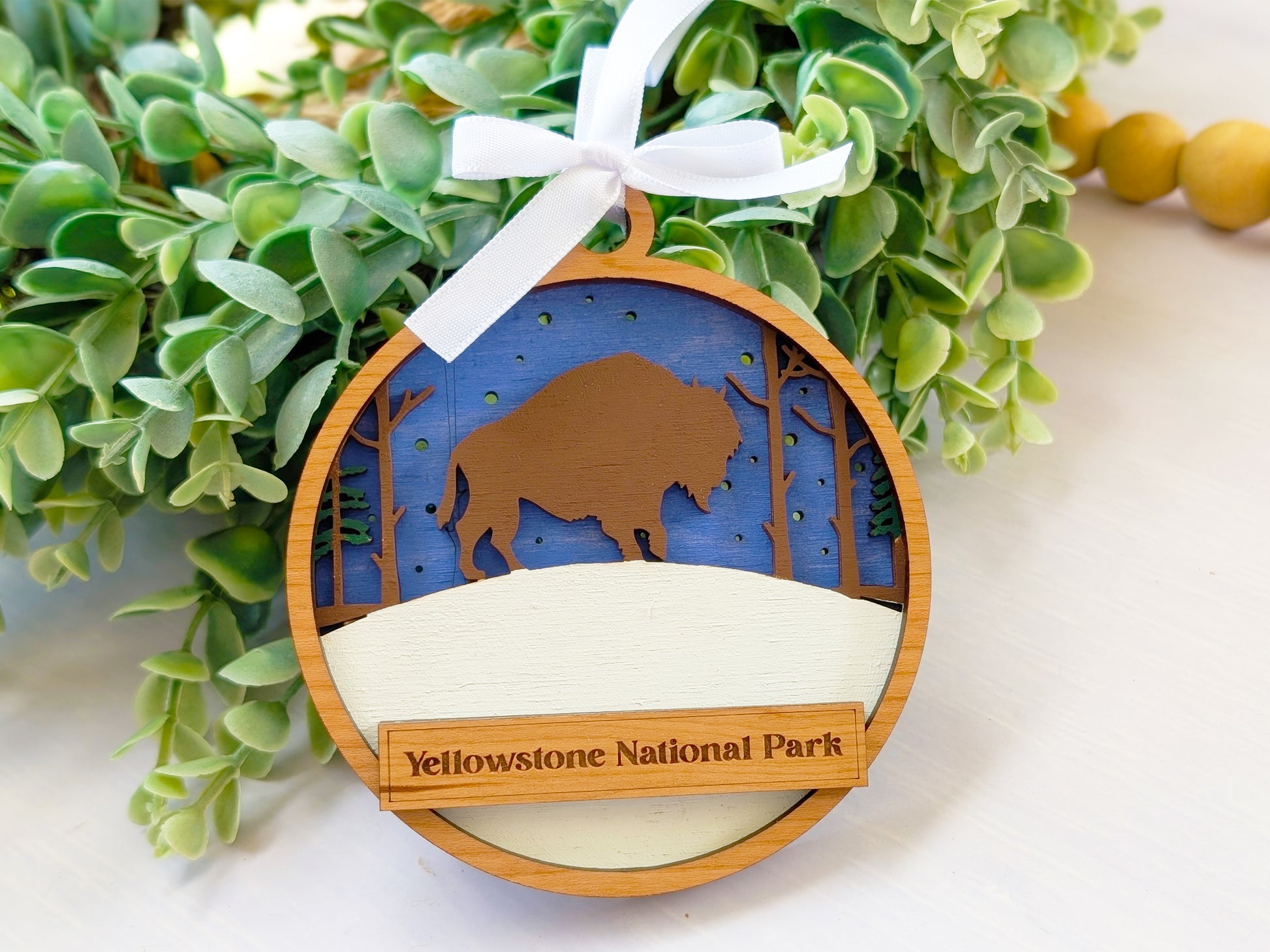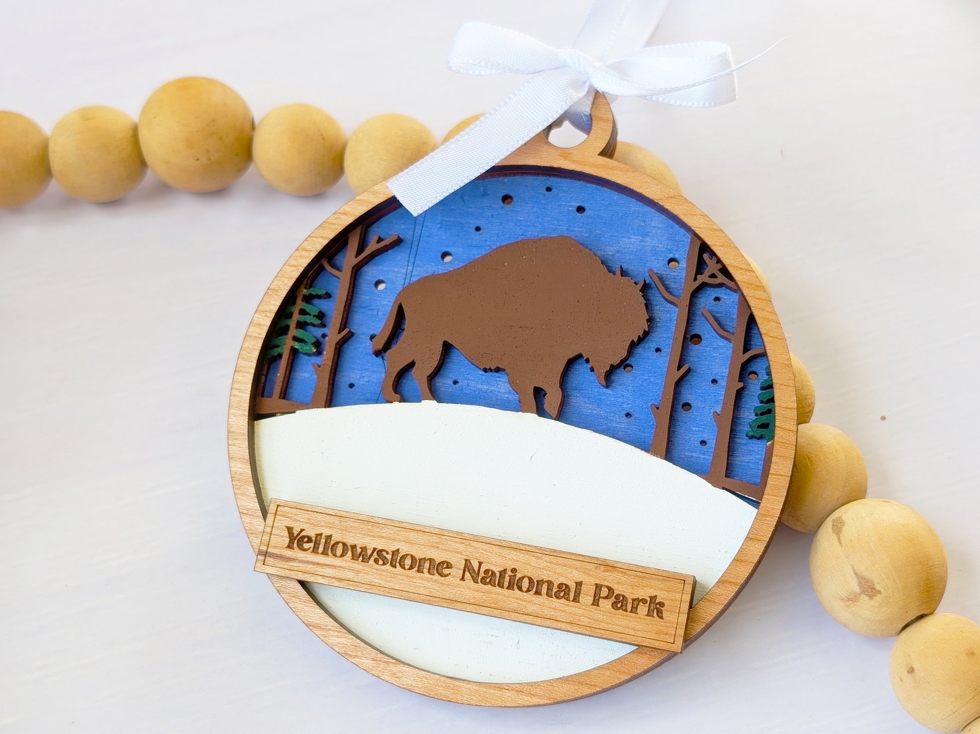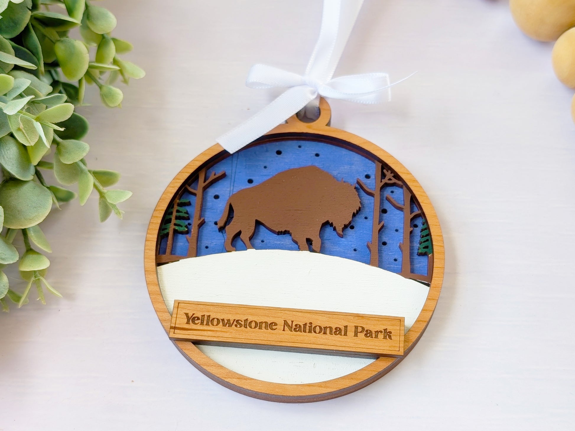 Create the perfect location-specific souvenir with this customizable handcrafted wooden ornament. Each piece features hand-painted bison scenes with iconic wildlife and prairie landscapes, complete with a personalized text banner that can display your shop name, location, or custom message. These versatile ornaments connect customers to their wildlife viewing memories while promoting your brand, making them ideal for gift shops, visitor centers, and tourist destinations nationwide.