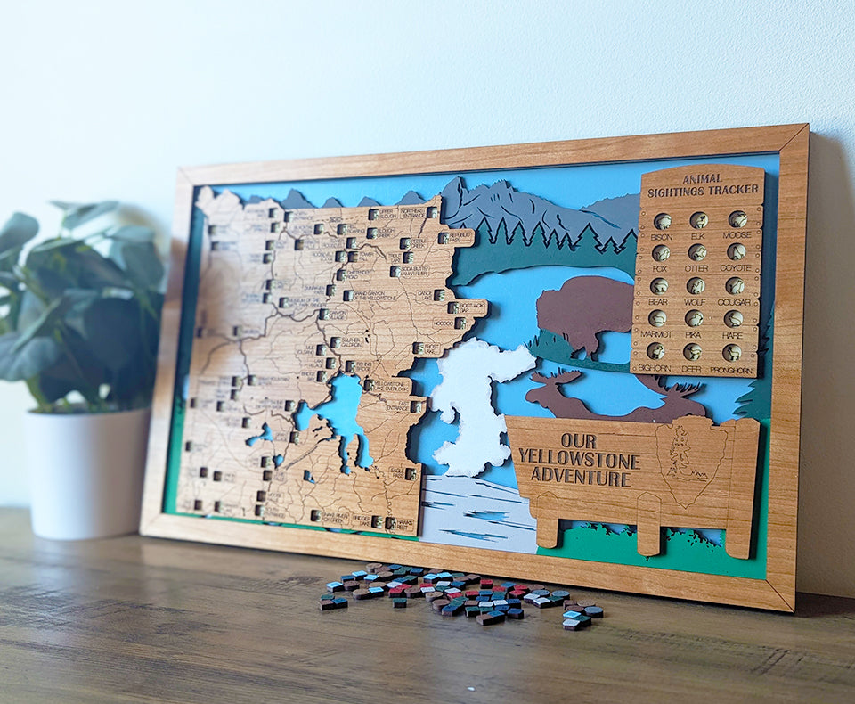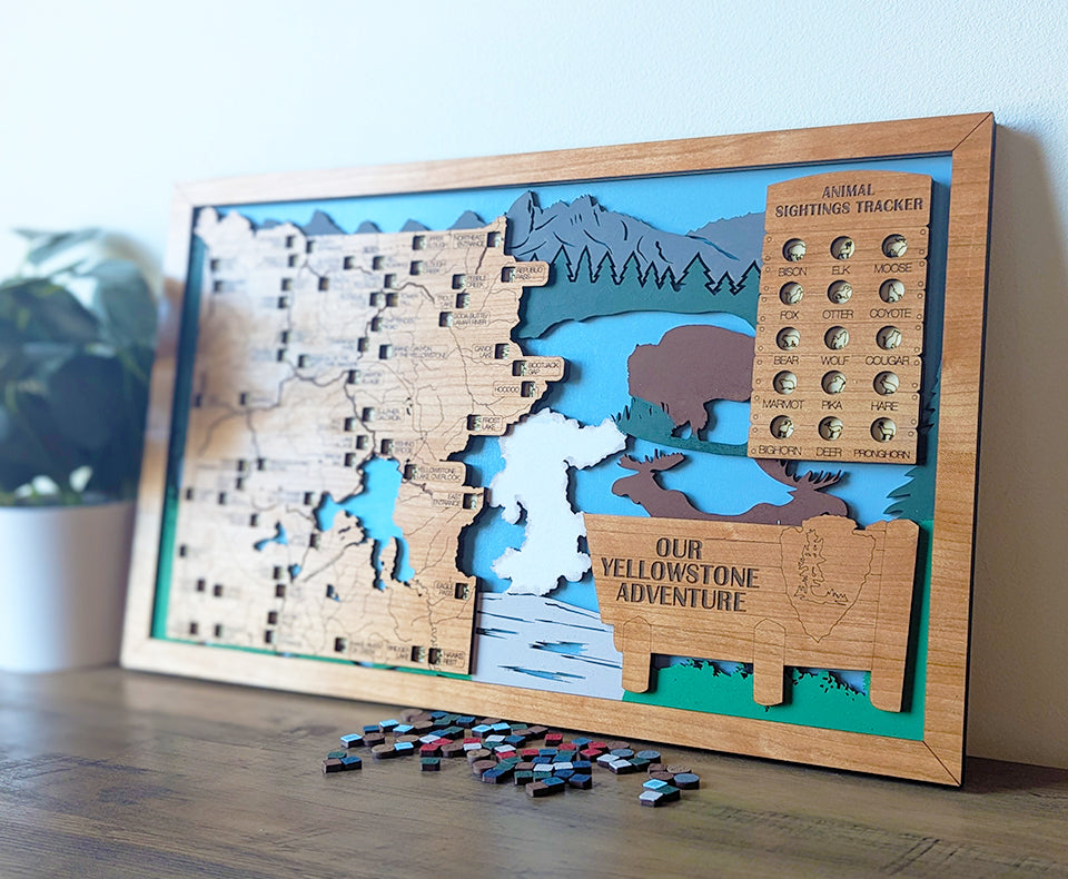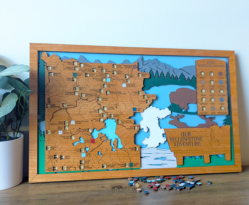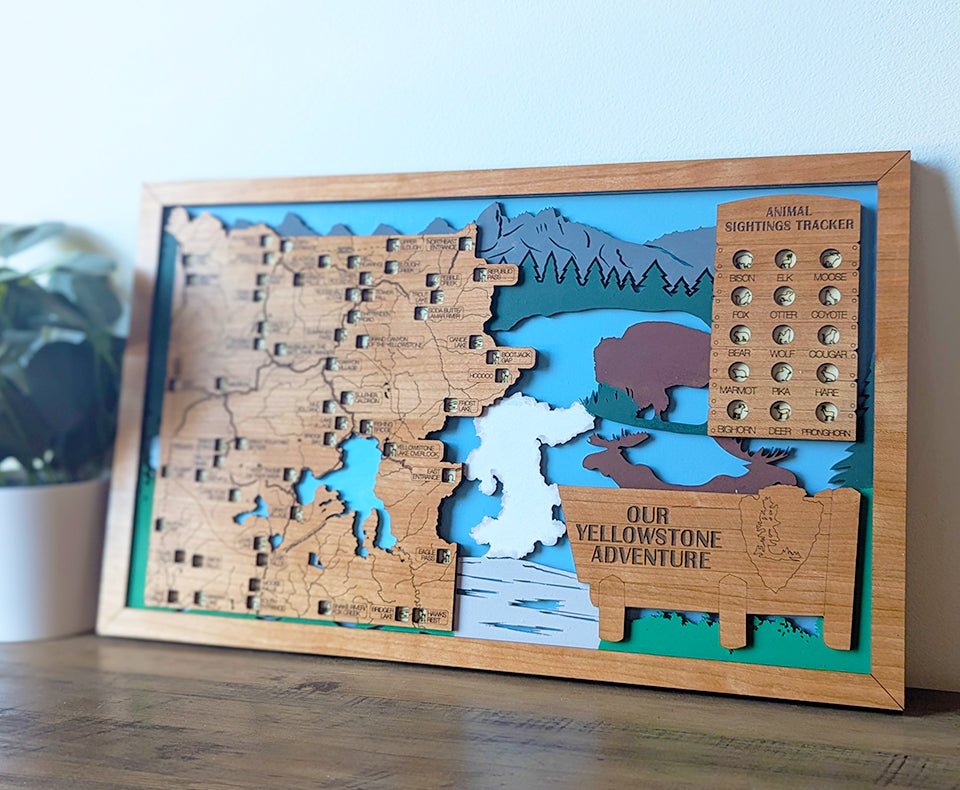 If you're looking for a unique never seen bucket list travel map, look no further! This wood travel map features over 55 of the top stops within Yellowstone National Park. Add hand painted markers to each location that you visit while also tracking 15 different wildlife with their own tokens as well. All locations, rivers and trails are laser engraved on beautiful cherry wood, while the middle layer of the map is hand painted featuring Old Faithful, bison and beautiful scenery from the park. This travel map is the perfect gift for National Parks lovers, those starting their retirement and families checking off Yellowstone from their bucket list.